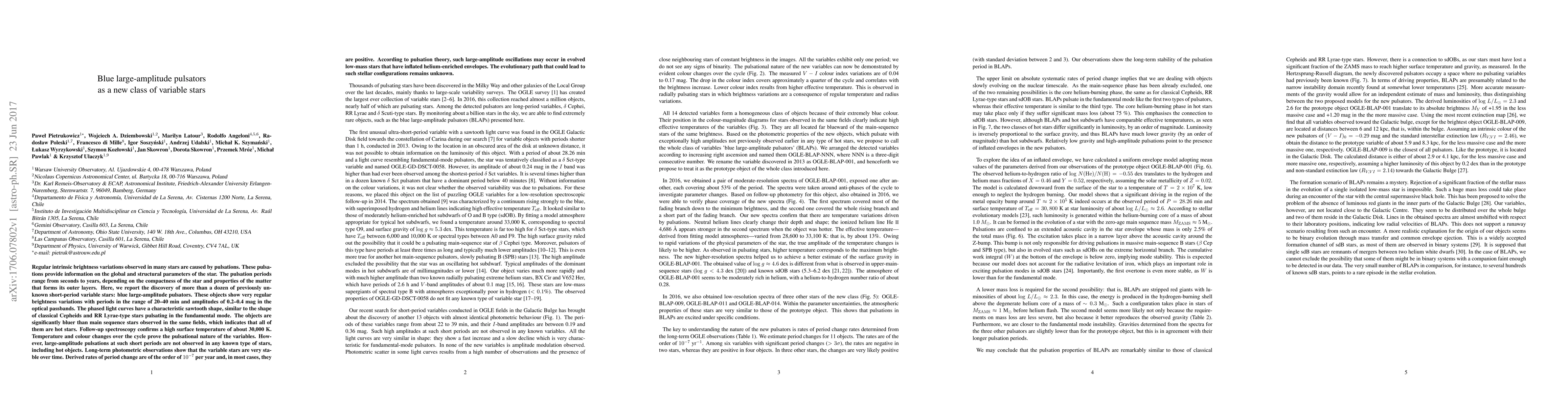 This paper reports the discovery of a new class of variable stars, blue large-amplitude pulsators, characterized by regular brightness variations with periods of 20-40 minutes and amplitudes of 0.2-0.4 mag. These stars exhibit a unique sawtooth light curve and high surface temperatures, suggesting they are evolved low-mass stars with helium-enriched envelopes, though their exact evolutionary path remains unknown.
