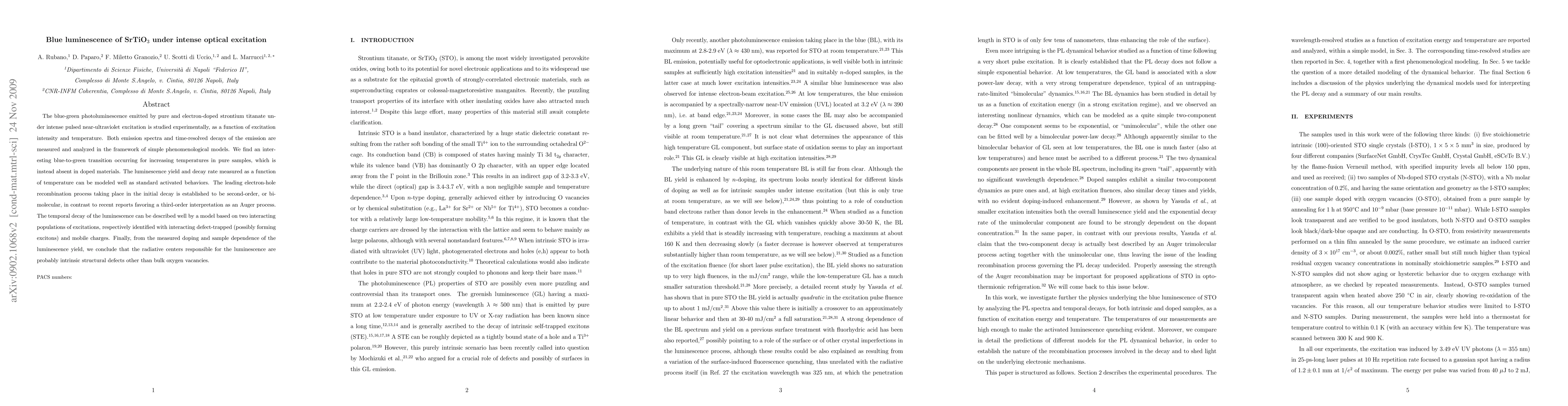 The blue-green photoluminescence emitted by pure and electron-doped strontium titanate under intense pulsed near-ultraviolet excitation is studied experimentally, as a function of excitation intensity and temperature. Both emission spectra and time-resolved decays of the emission are measured and analyzed in the framework of simple phenomenological models. We find an interesting blue-to-green transition occurring for increasing temperatures in pure samples, which is instead absent in doped materials. The luminescence yield and decay rate measured as a function of temperature can be modeled well as standard activated behaviors. The leading electron-hole recombination process taking place in the initial decay is established to be second-order, or bimolecular, in contrast to recent reports favoring a third-order interpretation as an Auger process. The temporal decay of the luminescence can be described well by a model based on two interacting populations of excitations, respectively identified with interacting defect-trapped (possibly forming excitons) and mobile charges. Finally, from the measured doping and sample dependence of the luminescence yield, we conclude that the radiative centers responsible for the luminescence are probably intrinsic structural defects other than bulk oxygen vacancies.
