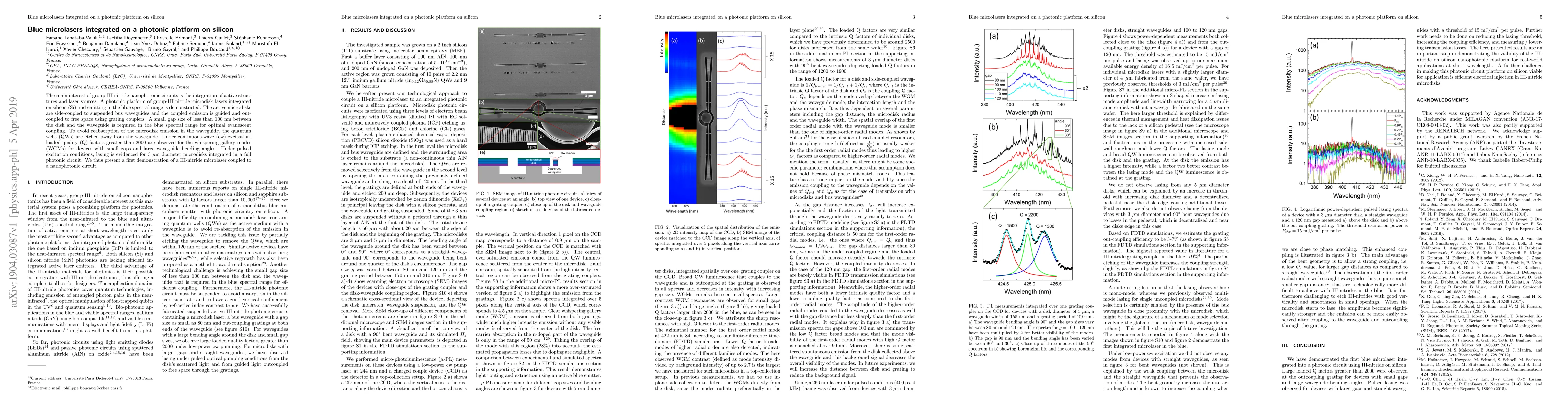 The paper demonstrates blue-emitting group-III-nitride microdisk lasers integrated with silicon photonic platforms, showing high-quality whispering gallery modes and successful lasing in a nanophotonic circuit, with effective coupling and minimal reabsorption.
