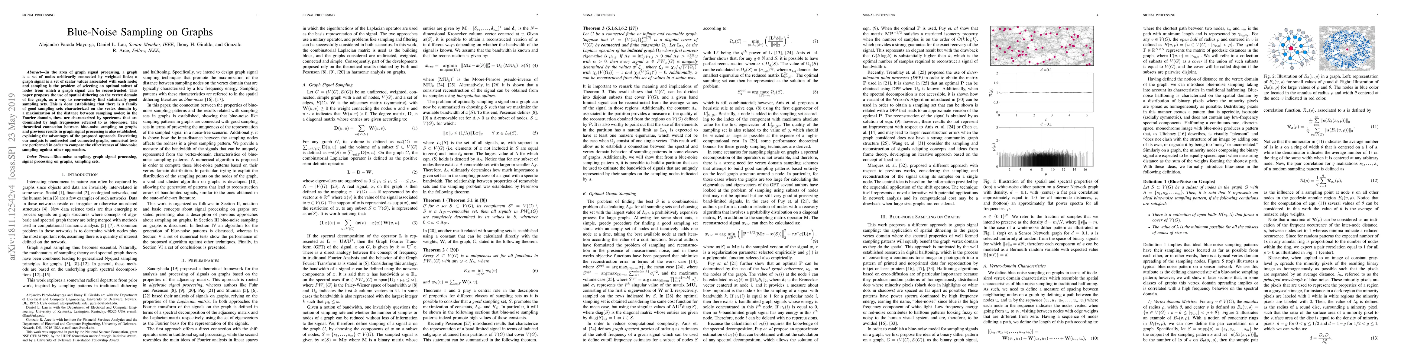 This paper introduces blue-noise sampling on graphs using spatial dithering to select optimal nodes for reconstructing graph signals, characterized by maximizing node distances and high-frequency spectra. Numerical tests demonstrate the effectiveness of this approach compared to other methods.