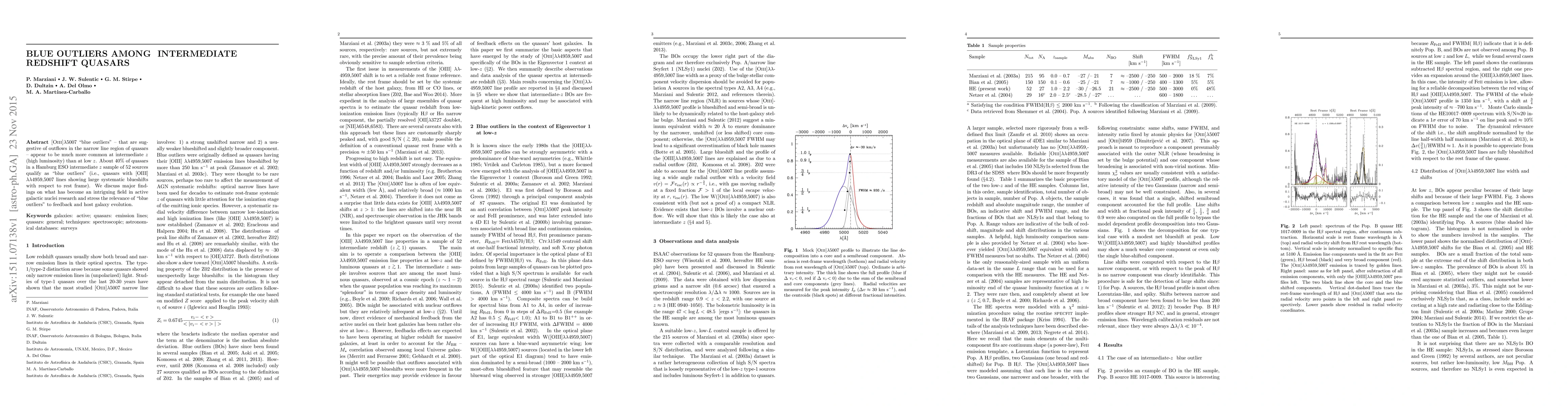 [Oiii]{\lambda}{\lambda}4959,5007 "blue outliers" -- that are suggestive of outflows in the narrow line region of quasars -- appear to be much more common at intermediate z (high luminosity) than at low z. About 40% of quasars in a Hamburg ESO intermediate-z sample of 52 sources qualify as blue outliers (i.e., quasars with [OIII] {\lambda}{\lambda}4959,5007 lines showing large systematic blueshifts with respect to rest frame). We discuss major findings on what has become an intriguing field in active galactic nuclei research and stress the relevance of blue outliers to feedback and host galaxy evolution.