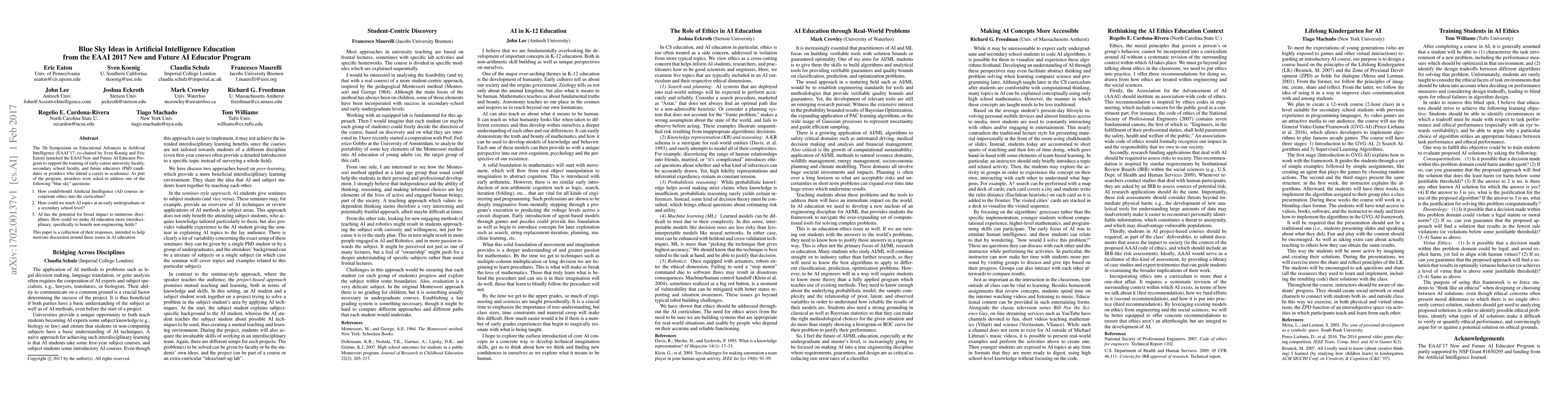 The 7th Symposium on Educational Advances in Artificial Intelligence (EAAI'17, co-chaired by Sven Koenig and Eric Eaton) launched the EAAI New and Future AI Educator Program to support the training of early-career university faculty, secondary school faculty, and future educators (PhD candidates or postdocs who intend a career in academia). As part of the program, awardees were asked to address one of the following "blue sky" questions: * How could/should Artificial Intelligence (AI) courses incorporate ethics into the curriculum? * How could we teach AI topics at an early undergraduate or a secondary school level? * AI has the potential for broad impact to numerous disciplines. How could we make AI education more interdisciplinary, specifically to benefit non-engineering fields? This paper is a collection of their responses, intended to help motivate discussion around these issues in AI education.