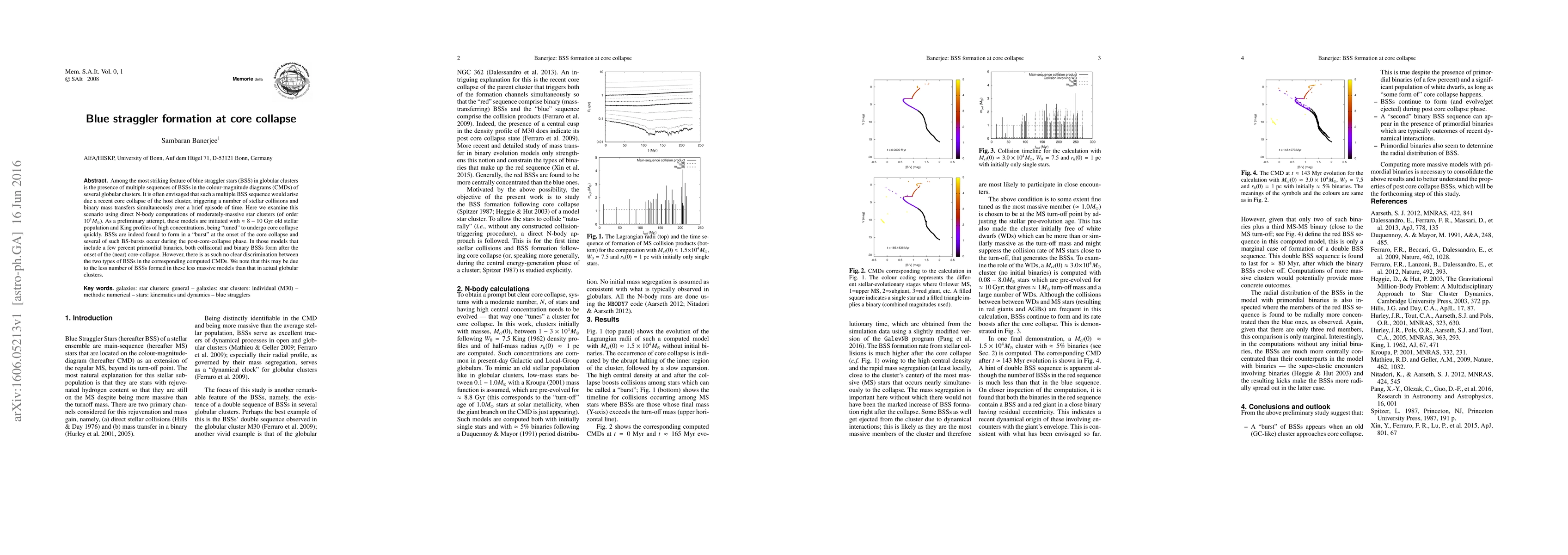 Among the most striking feature of blue straggler stars (BSS) is the presence of multiple sequences of BSSs in the colour-magnitude diagrams (CMDs) of several globular clusters. It is often envisaged that such a multiple BSS sequence would arise due a recent core collapse of the host cluster, triggering a number of stellar collisions and binary mass transfers simultaneously over a brief episode of time. Here we examine this scenario using direct N-body computations of moderately massive star clusters (of order 10^4 Msun ). As a preliminary attempt, these models are initiated with approx. 8-10 Gyr old stellar population and King profiles of high concentrations, being "tuned" to undergo core collapse quickly. BSSs are indeed found to form in a "burst" at the onset of the core collapse and several of such BS-bursts occur during the post-core-collapse phase. In those models that include a few percent primordial binaries, both collisional and binary BSSs form after the onset of the (near) core-collapse. However, there is as such no clear discrimination between the two types of BSSs in the corresponding computed CMDs. We note that this may be due to the less number of BSSs formed in these less massive models than that in actual globular clusters.