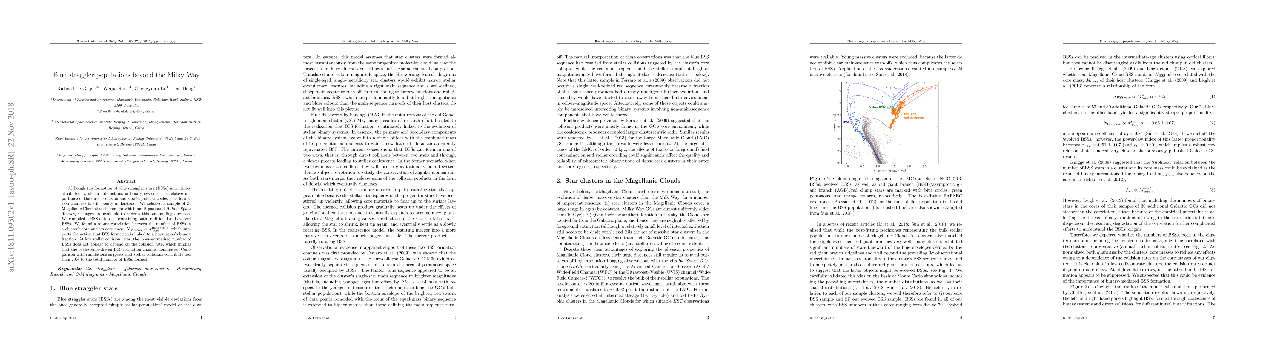 This study investigates blue straggler star (BSS) formation in 24 Magellanic Cloud star clusters using Hubble Space Telescope data. It finds a correlation between BSS number and core mass, indicating that BSS formation is linked to binary populations. The research concludes that coalescence-driven formation dominates, with stellar collisions contributing less than 20% to BSS formation.