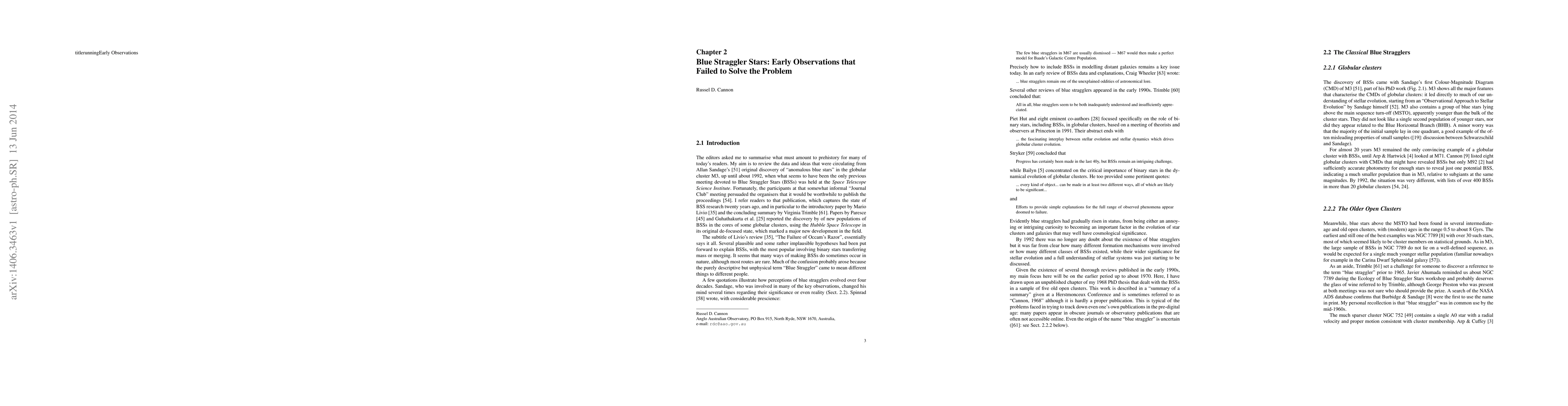 This chapter reviews early observations and theories surrounding blue straggler stars, starting from Allan Sandage's 1953 discovery of "anomalous blue stars" in M3, but concludes that none of these ideas successfully resolved the question of their origin by 1992.