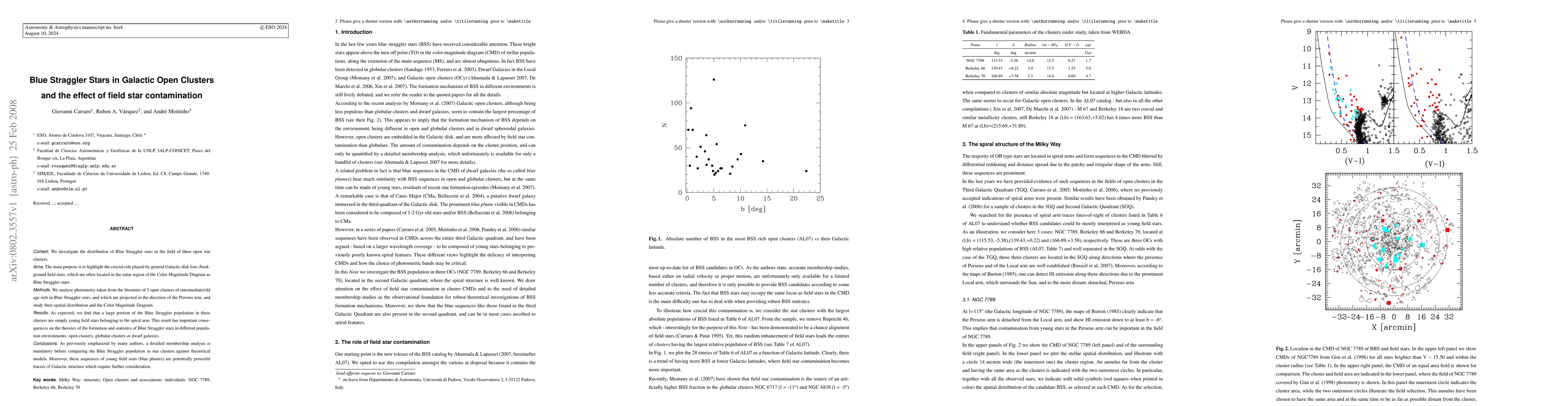 We investigate the distribution of Blue Straggler stars in the field of three open star clusters. The main purpose is to highlight the crucial role played by general Galactic disk fore-/back-ground field stars, which are often located in the same region of the Color Magnitude Diagram as Blue Straggler stars. We analyze photometry taken from the literature of 3 open clusters of intermediate/old age rich in Blue Straggler stars, and which are projected in the direction of the Perseus arm, and study their spatial distribution and the Color Magnitude Diagram. As expected, we find that a large portion of the Blue Straggler population in these clusters are simply young field stars belonging to the spiral arm. This result has important consequences on the theories of the formation and statistics of Blue Straggler stars in different population environments: open clusters, globular clusters or dwarf galaxies. As previously emphasized by many authors, a detailed membership analysis is mandatory before comparing the Blue Straggler population in star clusters against theoretical models. Moreover, these sequences of young field stars (blue plumes) are potentially powerful tracers of Galactic structure which require further consideration.