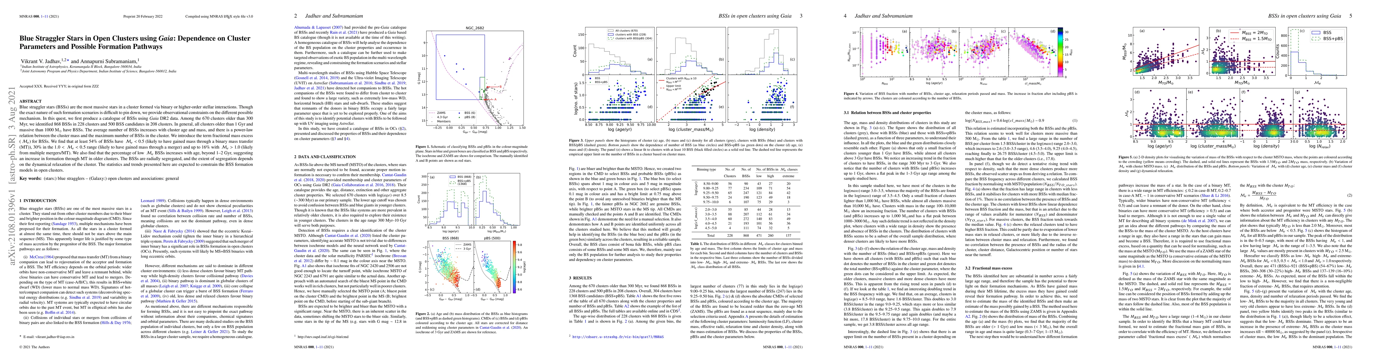 This paper catalogs blue straggler stars (BSSs) in open clusters using Gaia DR2 data, identifying 868 BSSs in 228 clusters. It finds a correlation between cluster age, mass, and BSS number, and introduces the fractional mass excess (Me) to classify BSSs by formation pathways, suggesting that binary mass transfer is the most common formation mechanism.