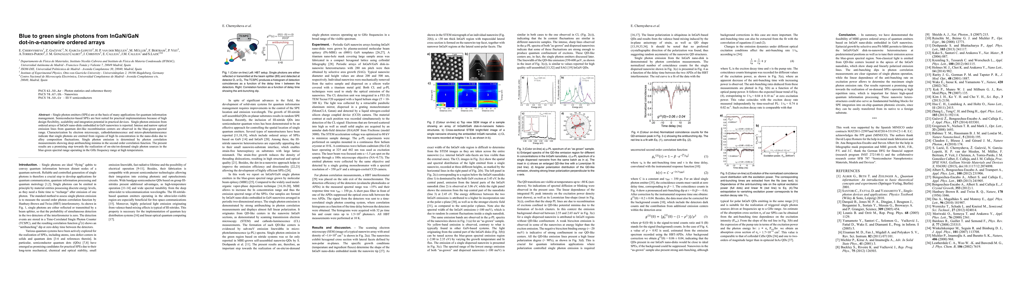 Research reports single-photon emission from ordered arrays of InGaN nano-disks in GaN nanowires, revealing intense and narrow optical lines in the blue-green range. Photon correlation measurements confirm single-photon emission, indicating potential for on-demand sources in quantum information management.