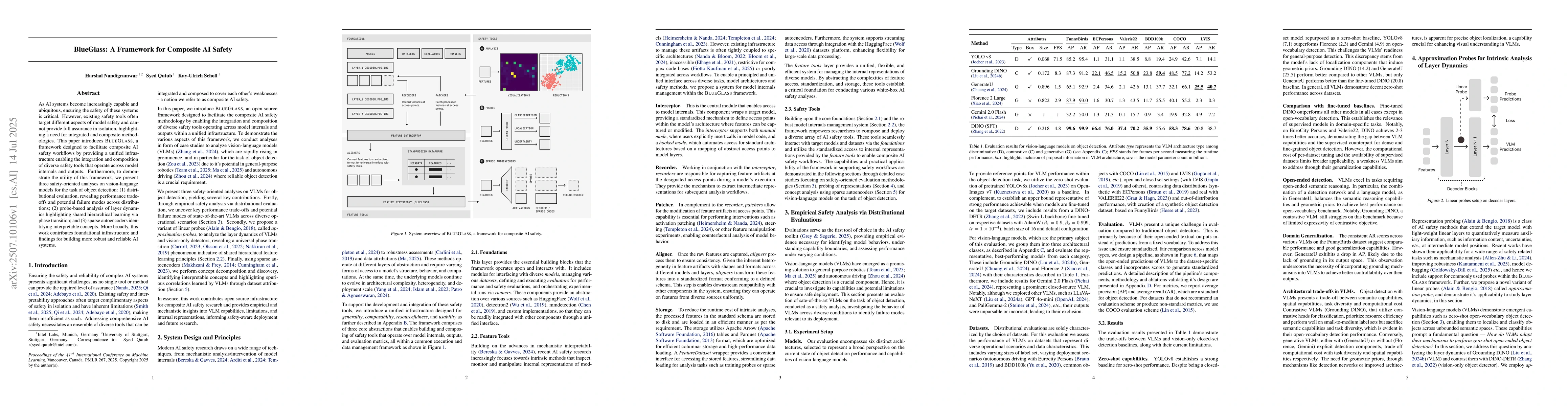 The paper introduces BlueGlass, a framework for integrating various AI safety tools to ensure comprehensive model safety. It demonstrates this through three analyses on vision-language models for object detection, uncovering performance trade-offs, hierarchical learning patterns, and interpretable concepts.