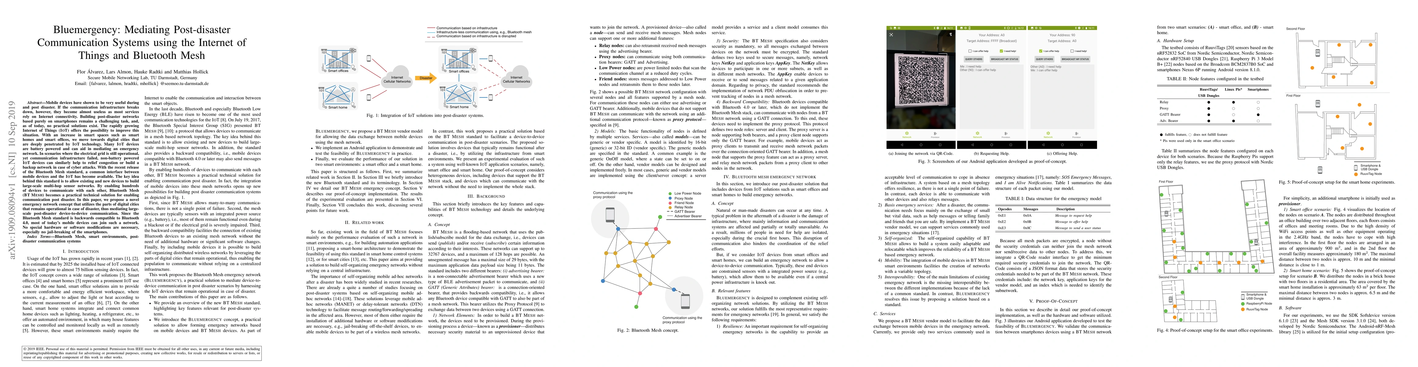 The paper proposes "Bluemergency," a novel emergency network concept leveraging the Internet of Things (IoT) and Bluetooth Mesh to facilitate post-disaster communication when traditional infrastructure fails. It utilizes operational IoT devices and existing smartphones to create a large-scale, multi-hop sensor network, enabling efficient device-to-device communication without requiring special hardware or software modifications.