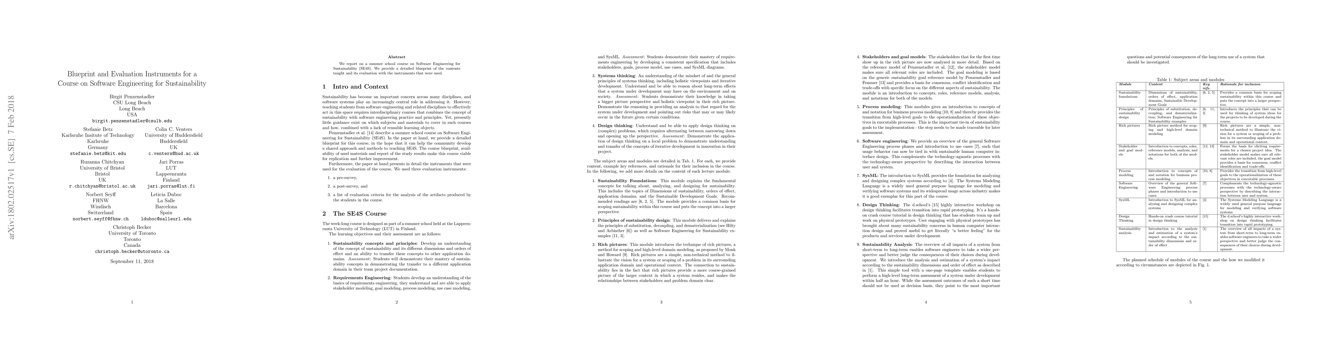 We report on a summer school course on Software Engineering for Sustainability (SE4S). We provide a detailed blueprint of the contents taught and its evaluation with the instruments that were used.