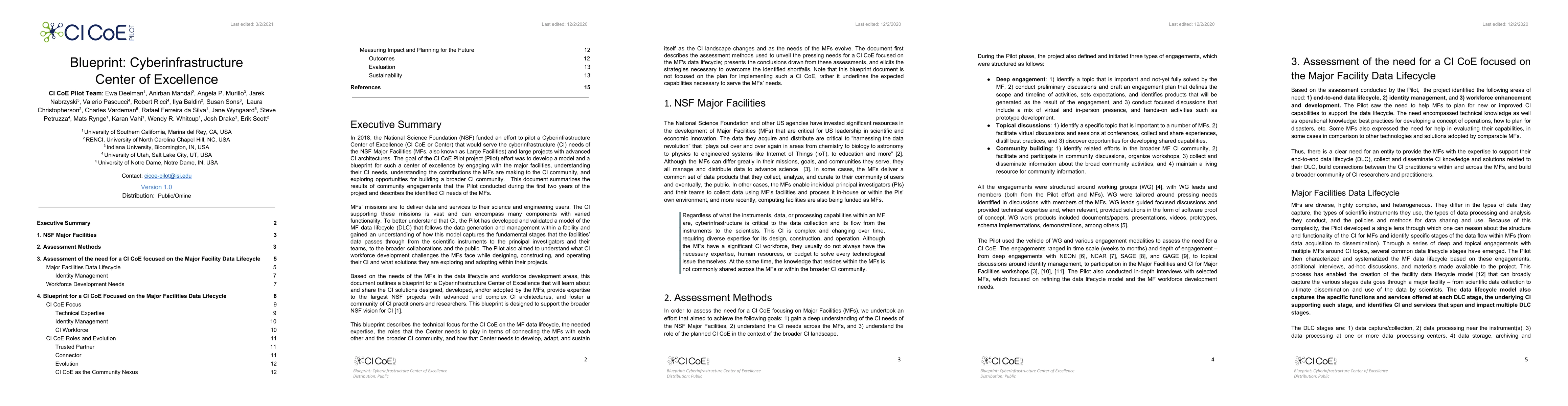 In 2018, NSF funded an effort to pilot a Cyberinfrastructure Center of Excellence (CI CoE or Center) that would serve the cyberinfrastructure (CI) needs of the NSF Major Facilities (MFs) and large projects with advanced CI architectures. The goal of the CI CoE Pilot project (Pilot) effort was to develop a model and a blueprint for such a CoE by engaging with the MFs, understanding their CI needs, understanding the contributions the MFs are making to the CI community, and exploring opportunities for building a broader CI community. This document summarizes the results of community engagements conducted during the first two years of the project and describes the identified CI needs of the MFs. To better understand MFs' CI, the Pilot has developed and validated a model of the MF data lifecycle that follows the data generation and management within a facility and gained an understanding of how this model captures the fundamental stages that the facilities' data passes through from the scientific instruments to the principal investigators and their teams, to the broader collaborations and the public. The Pilot also aimed to understand what CI workforce development challenges the MFs face while designing, constructing, and operating their CI and what solutions they are exploring and adopting within their projects. Based on the needs of the MFs in the data lifecycle and workforce development areas, this document outlines a blueprint for a CI CoE that will learn about and share the CI solutions designed, developed, and/or adopted by the MFs, provide expertise to the largest NSF projects with advanced and complex CI architectures, and foster a community of CI practitioners and researchers.