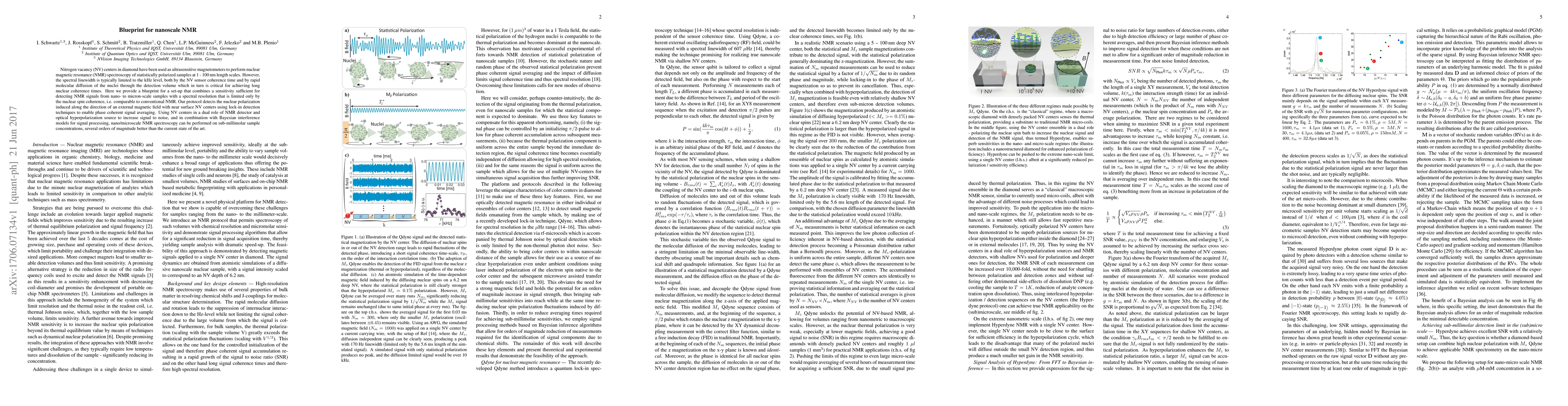 This paper proposes a novel setup utilizing nitrogen vacancy centers in diamond to achieve high-resolution nanoscale NMR spectroscopy, combining sensitivity with spectral resolution comparable to conventional NMR, and enabling detection of nuclear polarization in nano- to micron-scale samples at sub-millimolar concentrations. The method employs near-surface NV centers for detection and optical hyperpolarization, along with Bayesian signal processing for improved signal-to-noise ratio.