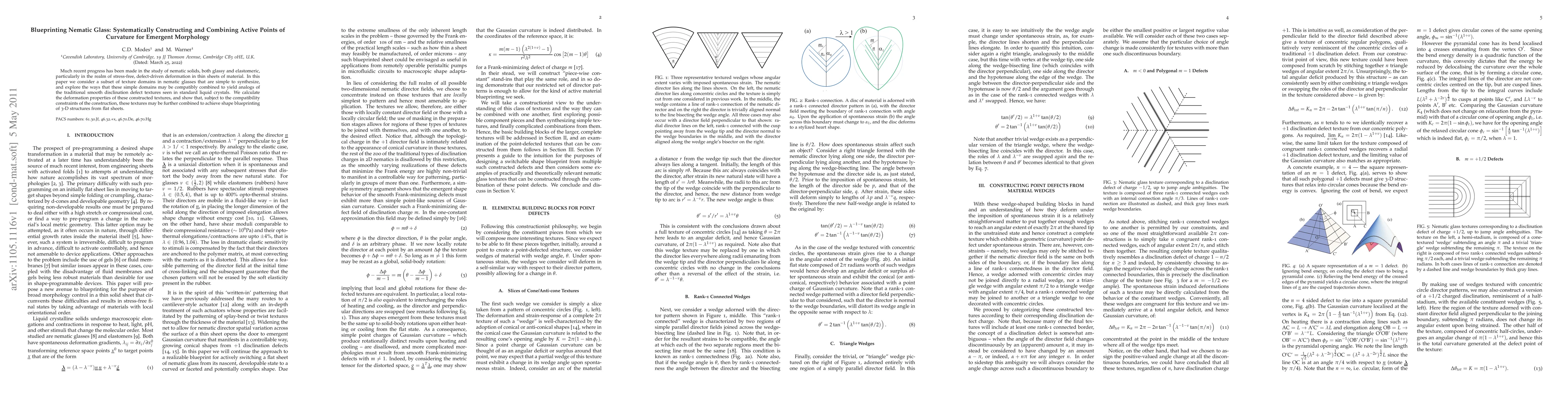 Much recent progress has been made in the study of nematic solids, both glassy and elastomeric, particularly in the realm of stress-free, defect-driven deformation in thin sheets of material. In this paper we consider a subset of texture domains in nematic glasses that are simple to synthesize, and explore the ways that these simple domains may be compatibly combined to yield analogs of the traditional smooth disclination defect textures seen in standard liquid crystals. We calculate the deformation properties of these constructed textures, and show that, subject to the compatibility constraints of the construction, these textures may be further combined to achieve shape blueprinting of 3-D structures from flat sheets.
