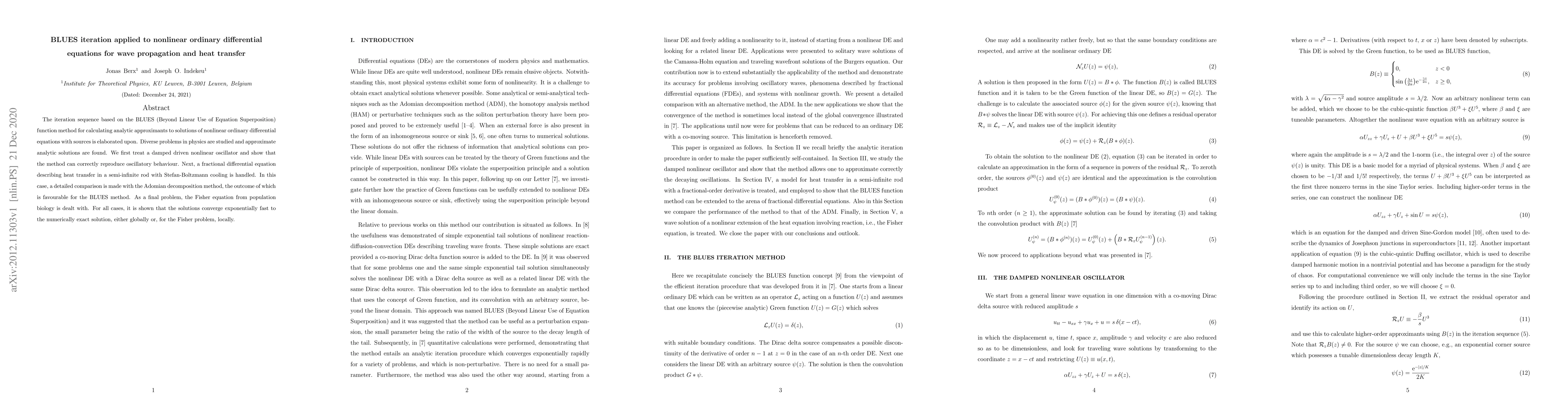 The iteration sequence based on the BLUES (Beyond Linear Use of Equation Superposition) function method for calculating analytic approximants to solutions of nonlinear ordinary differential equations with sources is elaborated upon. Diverse problems in physics are studied and approximate analytic solutions are found. We first treat a damped driven nonlinear oscillator and show that the method can correctly reproduce oscillatory behaviour. Next, a fractional differential equation describing heat transfer in a semi-infinite rod with Stefan-Boltzmann cooling is handled. In this case, a detailed comparison is made with the Adomian decomposition method, the outcome of which is favourable for the BLUES method. As a final problem, the Fisher equation from population biology is dealt with. For all cases, it is shown that the solutions converge exponentially fast to the numerically exact solution, either globally or, for the Fisher problem, locally.