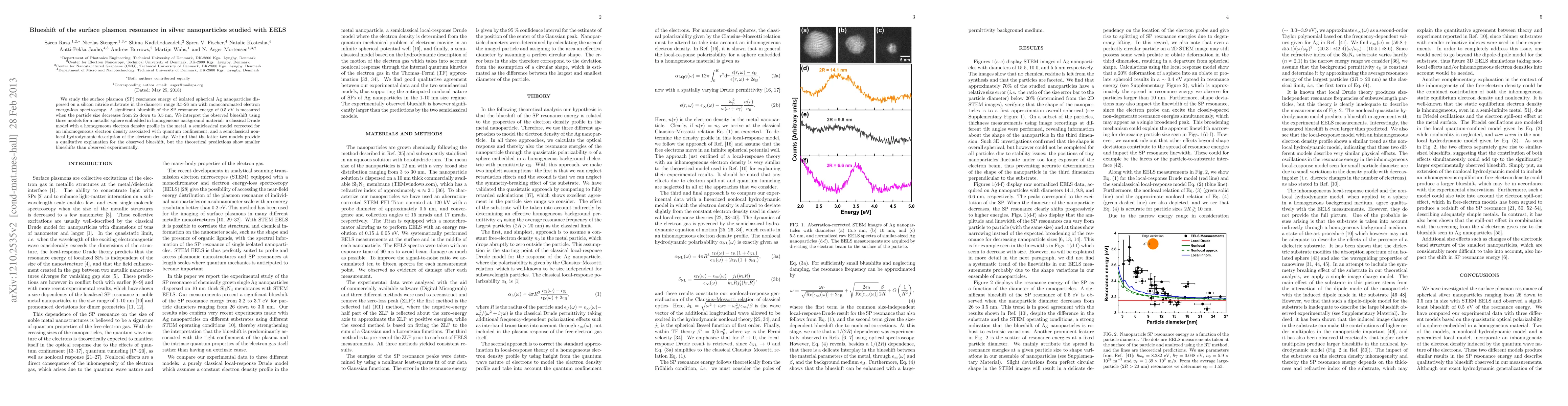 This study investigates the surface plasmon resonance (SPR) in silver nanoparticles using electron energy-loss spectroscopy, finding a significant blueshift in SPR energy as particle size decreases. Theoretical models, particularly semiclassical nonlocal hydrodynamic and inhomogeneous electron density models, partially explain the observed blueshift but underestimate it.