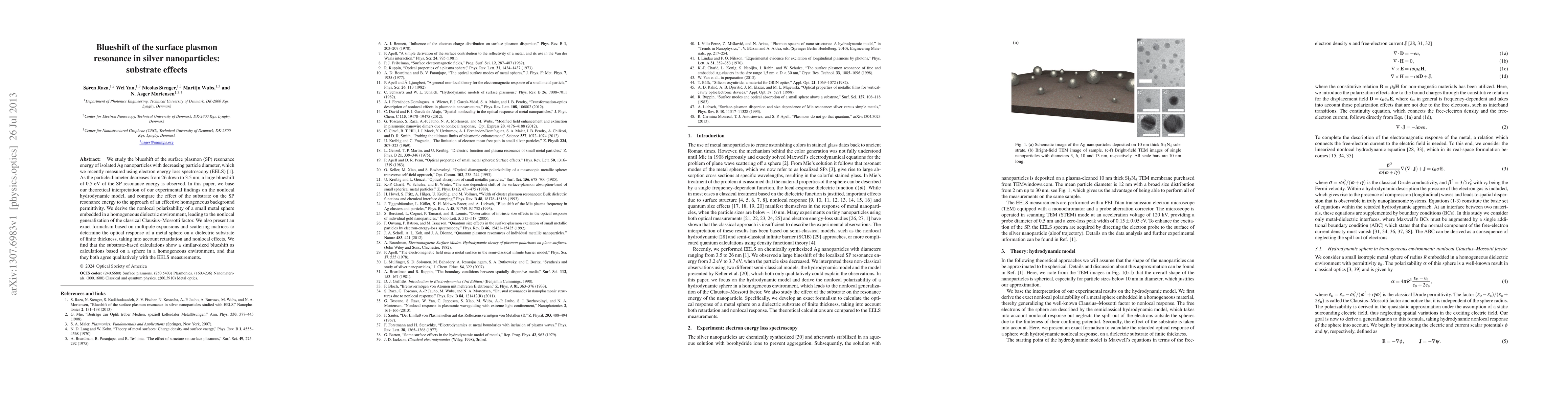 This paper investigates the blueshift in the surface plasmon resonance energy of silver nanoparticles as their diameter decreases, using electron energy loss spectroscopy. The study employs a nonlocal hydrodynamic model to theoretically interpret the experimental findings, showing that substrate effects produce a similar blueshift compared to calculations in a homogeneous environment.