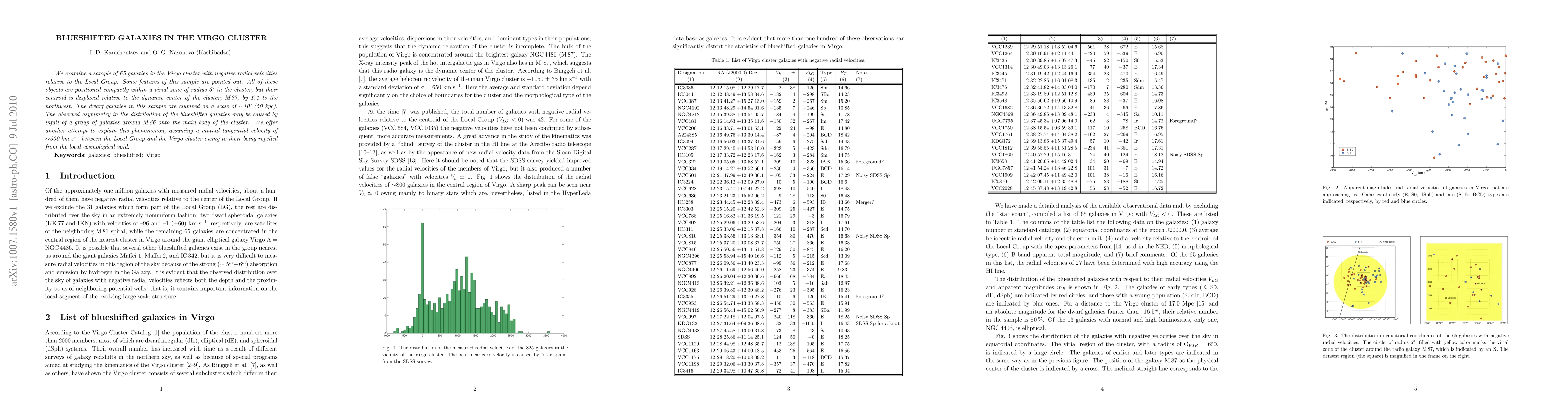 This study investigates 65 blueshifted galaxies in the Virgo cluster, noting their compact distribution and displacement from the cluster's dynamic center, M87. The researchers propose that this asymmetry could be due to the infall of a nearby galaxy group and suggest a tangential velocity of ~300 km/s between the Local Group and Virgo cluster as an alternative explanation.