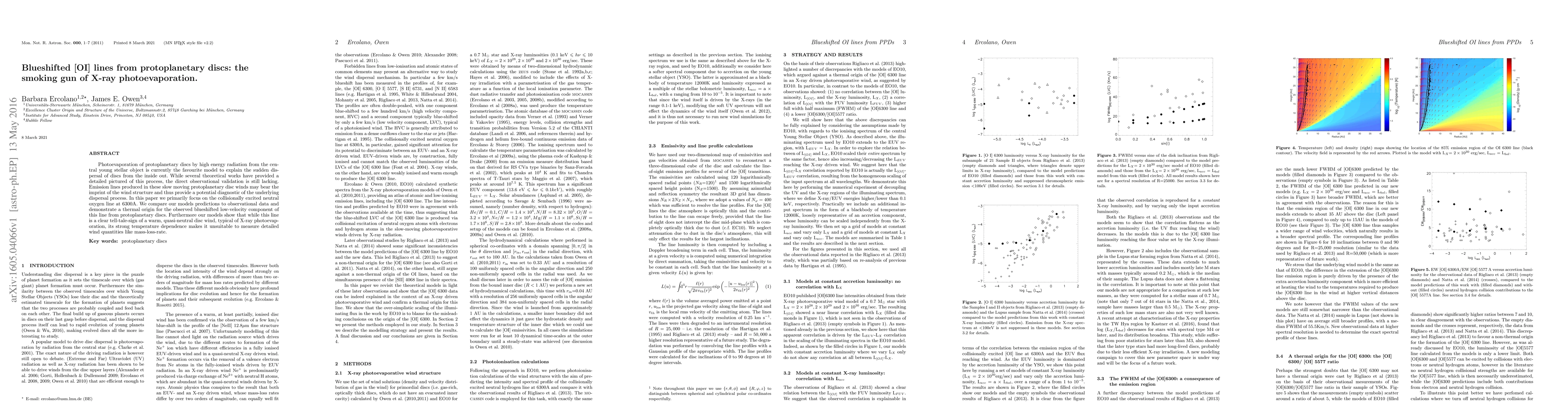 This paper investigates the blueshifted [OI] lines in protoplanetary discs, providing evidence for X-ray photoevaporation as a dispersal mechanism. The study finds a thermal origin for the observed blueshifted component, indicating a warm, quasi-neutral disc wind typical of X-ray photoevaporation, but notes its limited utility for measuring detailed wind properties.