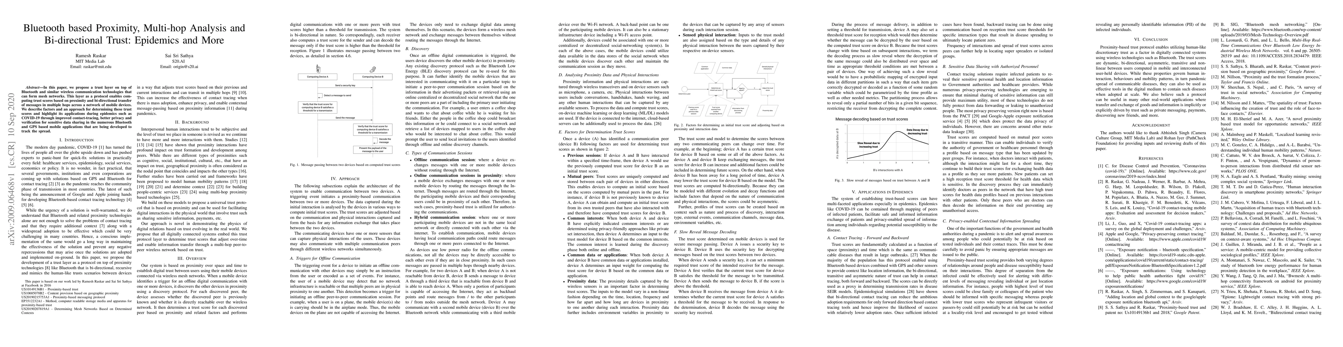 In this paper, we propose a trust layer on top of Bluetooth and similar wireless communication technologies that can form mesh networks. This layer as a protocol enables computing trust scores based on proximity and bi-directional transfer of messages in multiple hops across a network of mobile devices. We describe factors and an approach for determining these trust scores and highlight its applications during epidemics such as COVID-19 through improved contact-tracing, better privacy and verification for sensitive data sharing in the numerous Bluetooth and GPS based mobile applications that are being developed to track the spread.