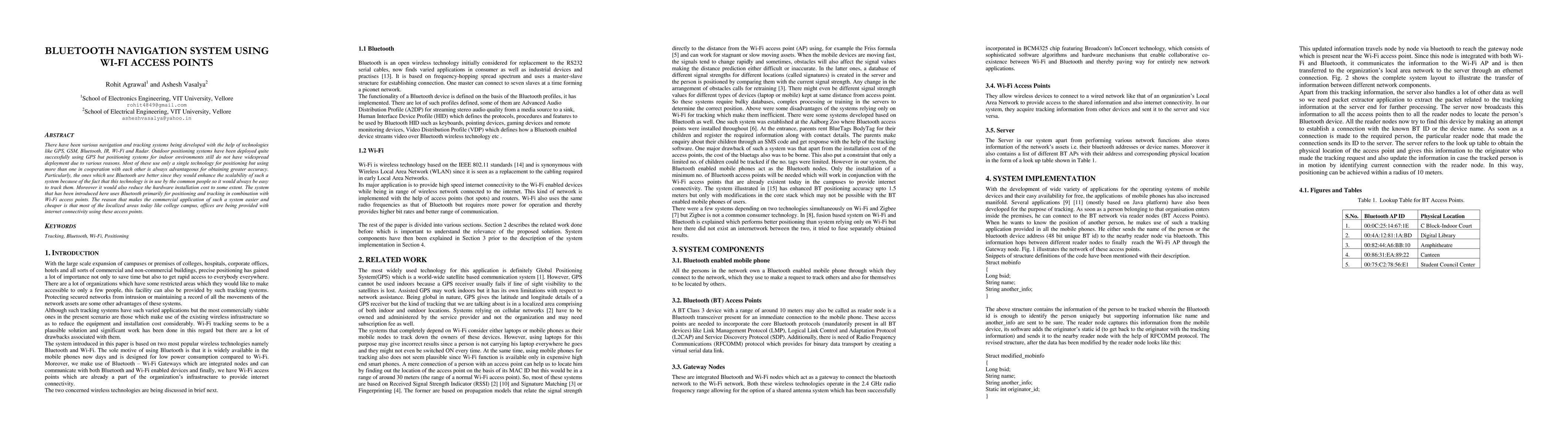 This paper proposes a Bluetooth-based navigation system that leverages Wi-Fi access points for enhanced indoor positioning accuracy. The integration of Bluetooth and Wi-Fi aims to reduce costs and improve scalability, taking advantage of existing internet infrastructure in localized areas.