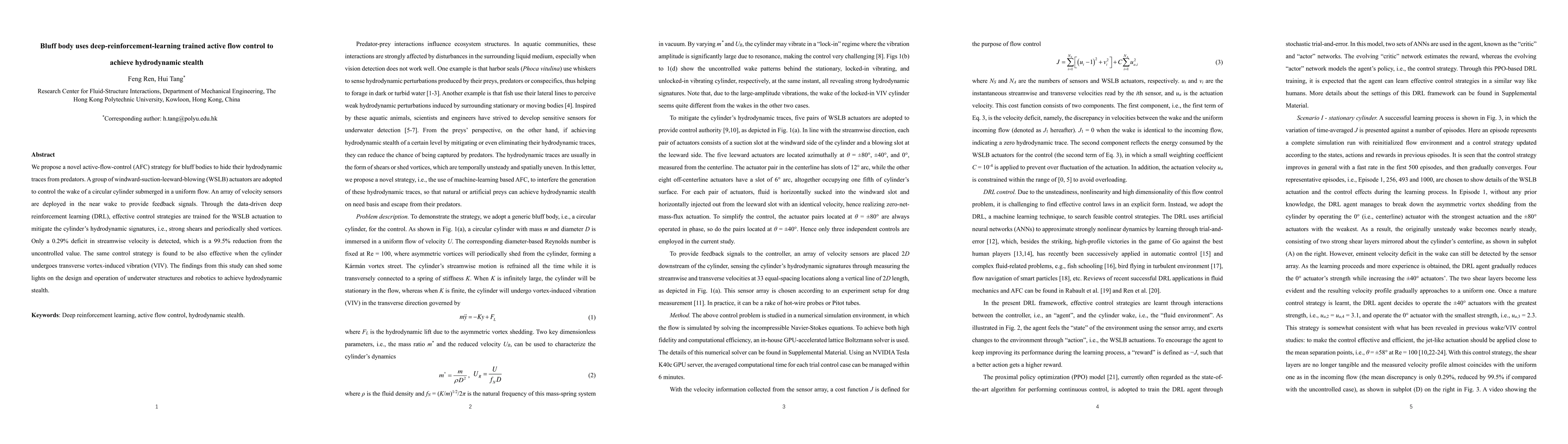 This paper proposes a deep-reinforcement-learning-trained active-flow-control strategy using WSLB actuators to reduce hydrodynamic signatures of bluff bodies, achieving a 99.5% reduction in detectable flow disturbances. The method is effective even during transverse vortex-induced vibrations, offering insights for hydrodynamic stealth in underwater structures and robotics.