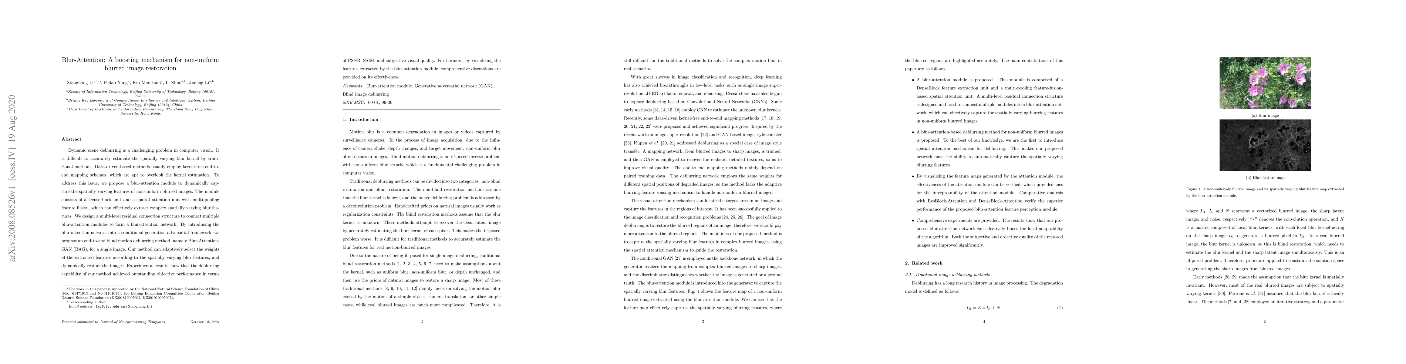 Dynamic scene deblurring is a challenging problem in computer vision. It is difficult to accurately estimate the spatially varying blur kernel by traditional methods. Data-driven-based methods usually employ kernel-free end-to-end mapping schemes, which are apt to overlook the kernel estimation. To address this issue, we propose a blur-attention module to dynamically capture the spatially varying features of non-uniform blurred images. The module consists of a DenseBlock unit and a spatial attention unit with multi-pooling feature fusion, which can effectively extract complex spatially varying blur features. We design a multi-level residual connection structure to connect multiple blur-attention modules to form a blur-attention network. By introducing the blur-attention network into a conditional generation adversarial framework, we propose an end-to-end blind motion deblurring method, namely Blur-Attention-GAN (BAG), for a single image. Our method can adaptively select the weights of the extracted features according to the spatially varying blur features, and dynamically restore the images. Experimental results show that the deblurring capability of our method achieved outstanding objective performance in terms of PSNR, SSIM, and subjective visual quality. Furthermore, by visualizing the features extracted by the blur-attention module, comprehensive discussions are provided on its effectiveness.