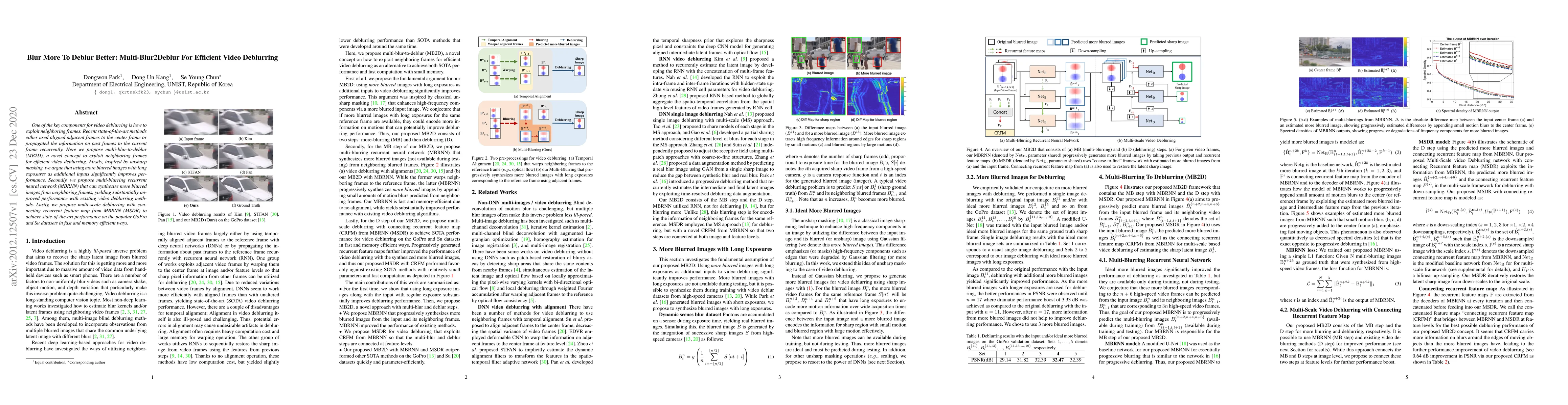 This paper proposes Multi-Blur-to-Deblur (MB2D), a method that leverages more blurred images from neighboring frames to enhance video deblurring efficiency. It introduces a multi-blurring recurrent neural network (MBRNN) and a multi-scale deblurring approach (MSDR) to achieve state-of-the-art performance on deblurring datasets while maintaining computational efficiency.
