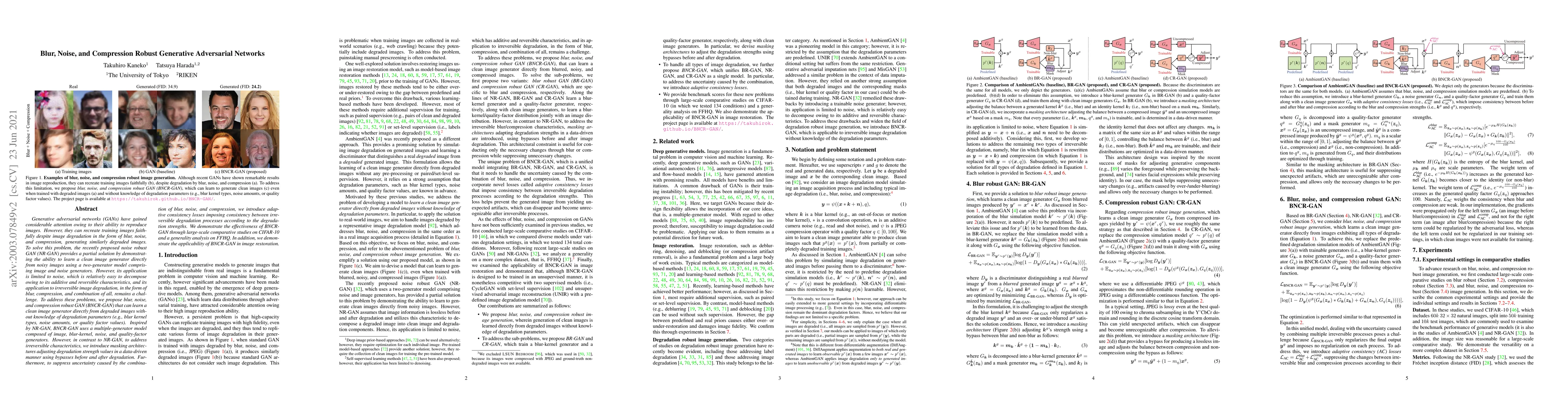 The paper proposes a BNCR-GAN to generate clean images from degraded images with blur, noise, and compression, addressing the limitations of existing noise robust GANs. It introduces masking architectures and adaptive consistency losses to handle irreversible degradations and demonstrates its effectiveness through comparative studies and image restoration applications.
