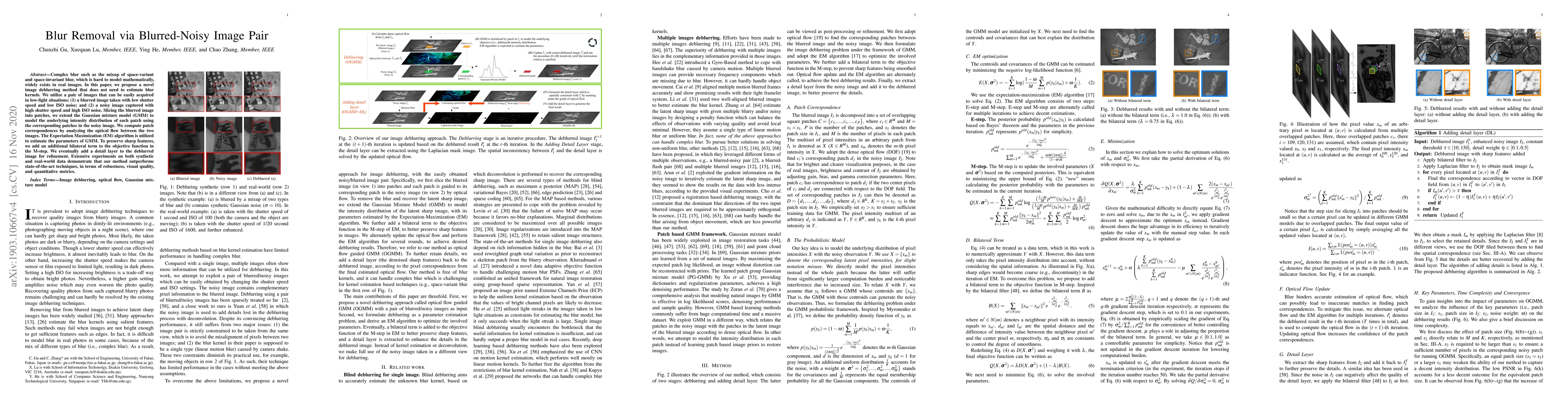 This paper proposes a novel deblurring method that leverages a pair of blurred-noisy images to remove complex blur without estimating blur kernels. It uses the Gaussian mixture model to model intensity distributions and the Expectation Maximization algorithm for parameter estimation, achieving superior results compared to state-of-the-art techniques.