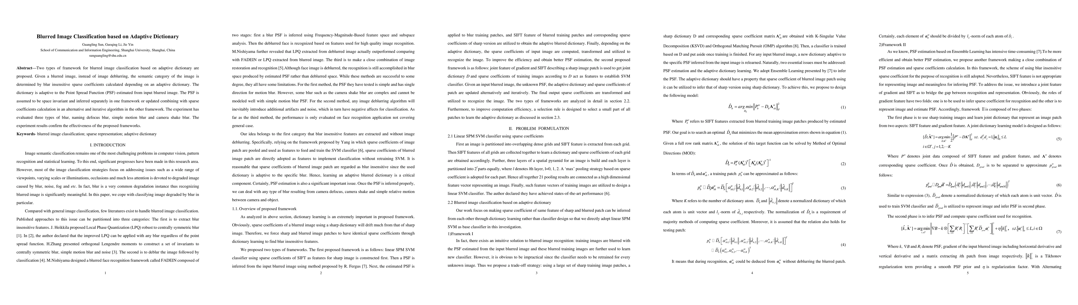 This paper proposes two frameworks for classifying blurred images using adaptive dictionaries, determining image categories through blur-insensitive sparse coefficients without deblurring. The adaptive dictionary adjusts to the estimated Point Spread Function (PSF) from the blurred image, with the PSF inferred separately or updated iteratively. Experiments on defocus, motion, and camera shake blurs validate the effectiveness of the proposed methods.