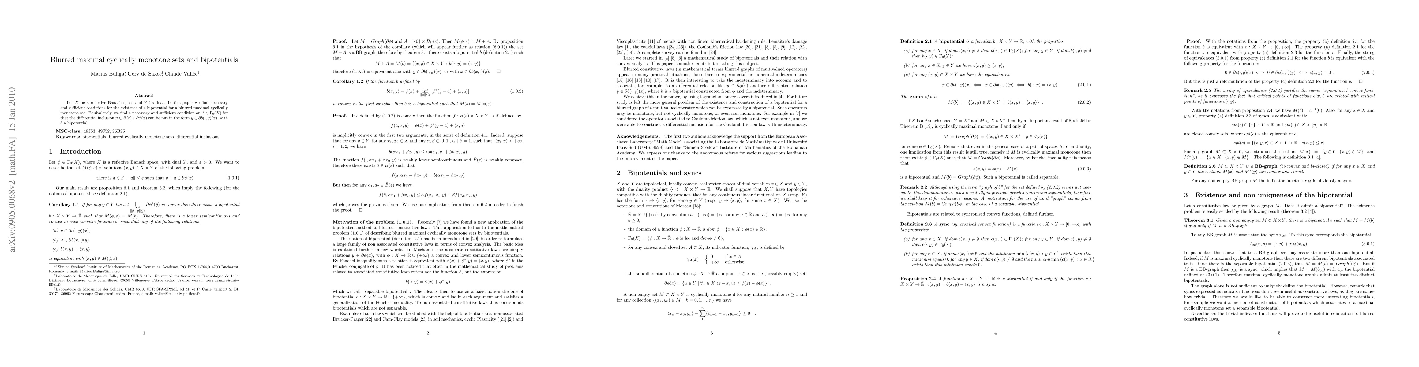 Let X be a reflexive Banach space and Y its dual. In this paper we find necessary and sufficient conditions for the existence of a bipotential for a blurred maximal cyclically monotone graph. Equivalently, we find a necessary and sufficient condition on $\phi \in \Gamma_{0}(X)$ for that the differential inclusion $y \in \bar{B}(\epsilon) + \partial \phi(x)$ can be put in the form $y \in \partial b(\cdot, y)(x)$, with $b$ a bipotential.