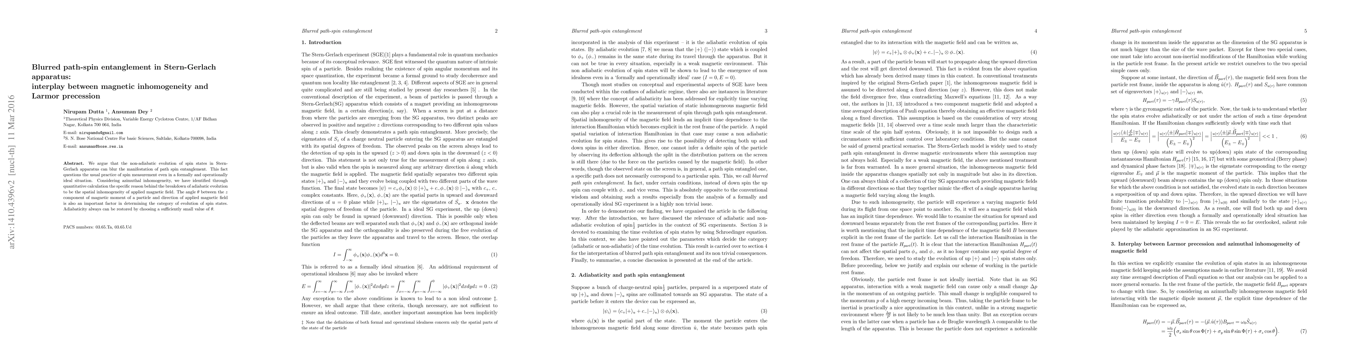This paper investigates how non-adiabatic evolution of spin states in a Stern-Gerlach apparatus, due to magnetic field inhomogeneity and Larmor precession, can obscure path-spin entanglement. It concludes that adiabaticity can be restored by minimizing the angle between the particle's magnetic moment and the applied magnetic field.
