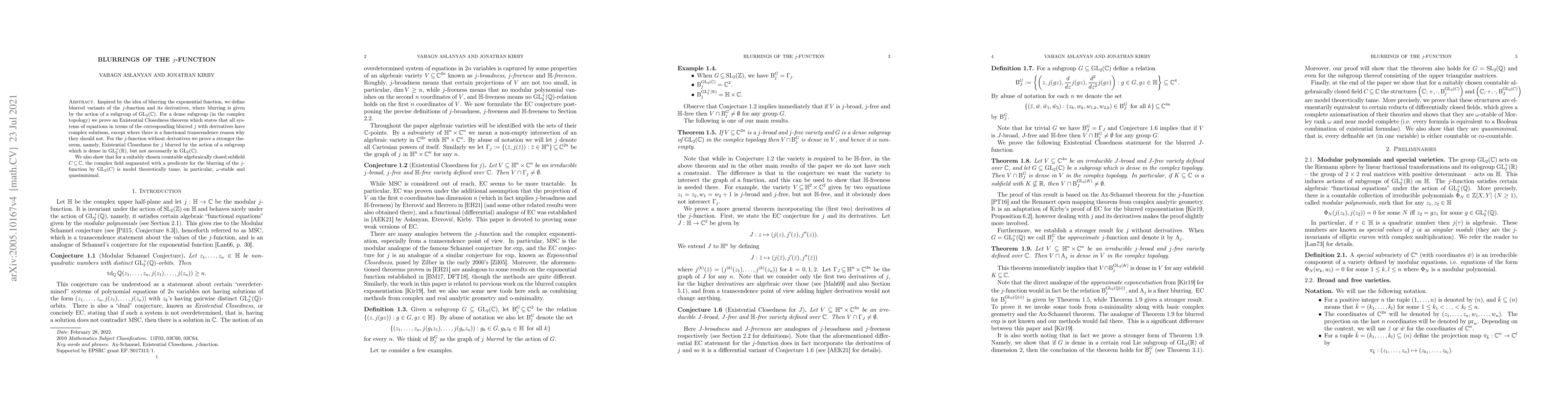 Inspired by the idea of blurring the exponential function, we define blurred variants of the $j$-function and its derivatives, where blurring is given by the action of a subgroup of $\rm{GL}_2(\mathbb{C})$. For a dense subgroup (in the complex topology) we prove an Existential Closedness theorem which states that all systems of equations in terms of the corresponding blurred $j$ with derivatives have complex solutions, except where there is a functional transcendence reason why they should not. For the $j$-function without derivatives we prove a stronger theorem, namely, Existential Closedness for $j$ blurred by the action of a subgroup which is dense in $\rm{GL}_2^+(\mathbb{R})$, but not necessarily in $\rm{GL}_2(\mathbb{C})$. We also show that for a suitably chosen countable algebraically closed subfield $C \subseteq \mathbb{C}$, the complex field augmented with a predicate for the blurring of the $j$-function by $\rm{GL}_2(C)$ is model theoretically tame, in particular, $\omega$-stable and quasiminimal.