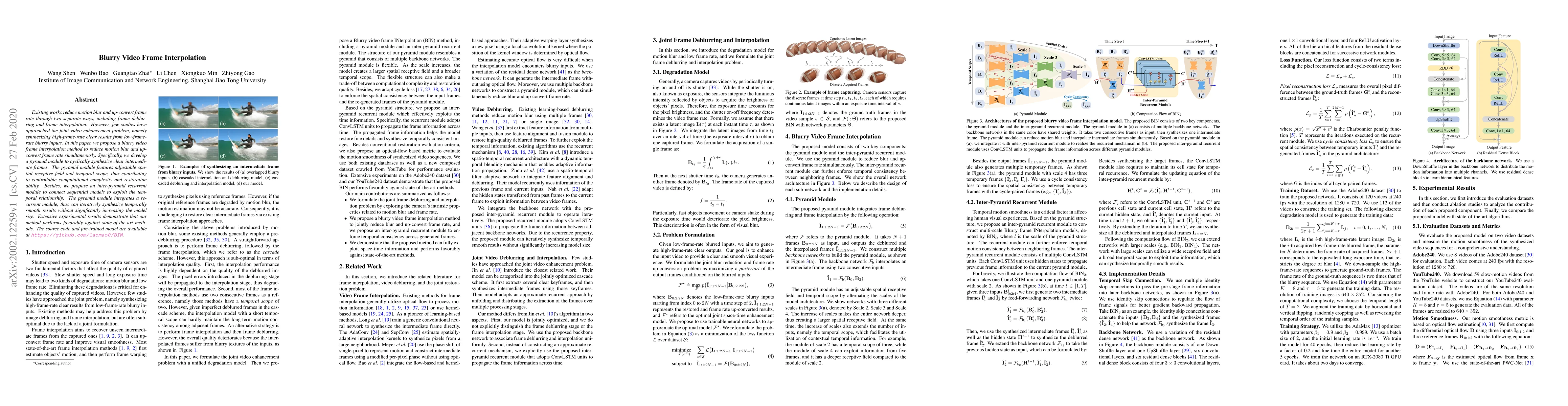 This paper proposes a method for blurry video frame interpolation to simultaneously reduce motion blur and increase frame rate. It utilizes a pyramid module with adjustable spatial and temporal scopes for clear intermediate frame synthesis and an inter-pyramid recurrent module to leverage temporal relationships, achieving effective results with controlled computational complexity.