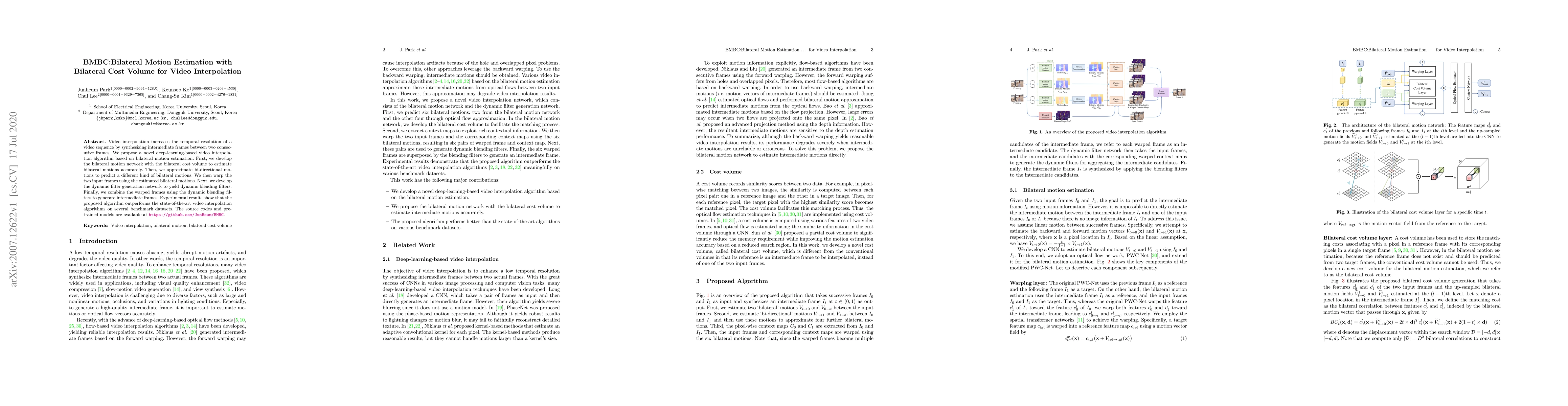 The paper proposes a novel deep-learning-based video interpolation algorithm using bilateral motion estimation with bilateral cost volume. The method synthesizes intermediate frames by warping input frames with dynamic blending filters, achieving superior results compared to existing algorithms on benchmark datasets.