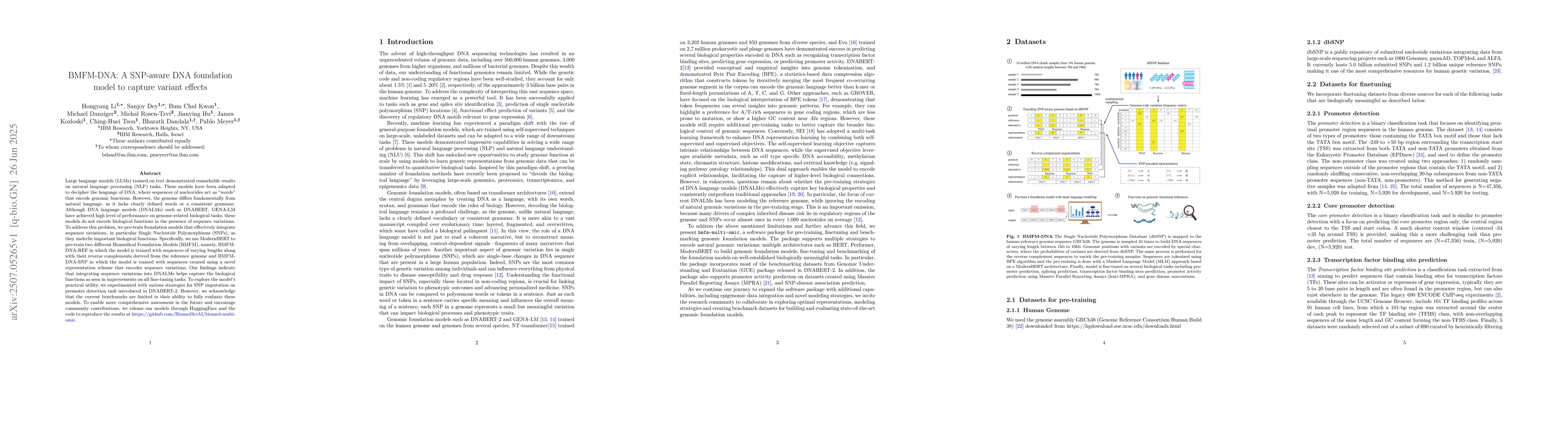 Large language models (LLMs) trained on text demonstrated remarkable results on natural language processing (NLP) tasks. These models have been adapted to decipher the language of DNA, where sequences of nucleotides act as "words" that encode genomic functions. However, the genome differs fundamentally from natural language, as it lacks clearly defined words or a consistent grammar. Although DNA language models (DNALMs) such as DNABERT, GENA-LM have achieved high level of performance on genome-related biological tasks, these models do not encode biological functions in the presence of sequence variations. To address this problem, we pre-train foundation models that effectively integrate sequence variations, in particular Single Nucleotide Polymorphisms (SNPs), as they underlie important biological functions. Specifically, we use ModernBERT to pre-train two different Biomedical Foundation Models (BMFM), namely, BMFM-DNA-REF in which the model is trained with sequences of varying lengths along with their reverse complements derived from the reference genome and BMFM-DNA-SNP in which the model is trained with sequences created using a novel representation scheme that encodes sequence variations. Our findings indicate that integrating sequence variations into DNALMs helps capture the biological functions as seen in improvements on all fine-tuning tasks. To explore the model's practical utility, we experimented with various strategies for SNP imputation on promoter detection task introduced in DNABERT-2. However, we acknowledge that the current benchmarks are limited in their ability to fully evaluate these models. To enable more comprehensive assessment in the future and encourage community contributions, we release our models through HuggingFace and the code to reproduce the results at https://github.com/BiomedSciAI/biomed-multi-omic