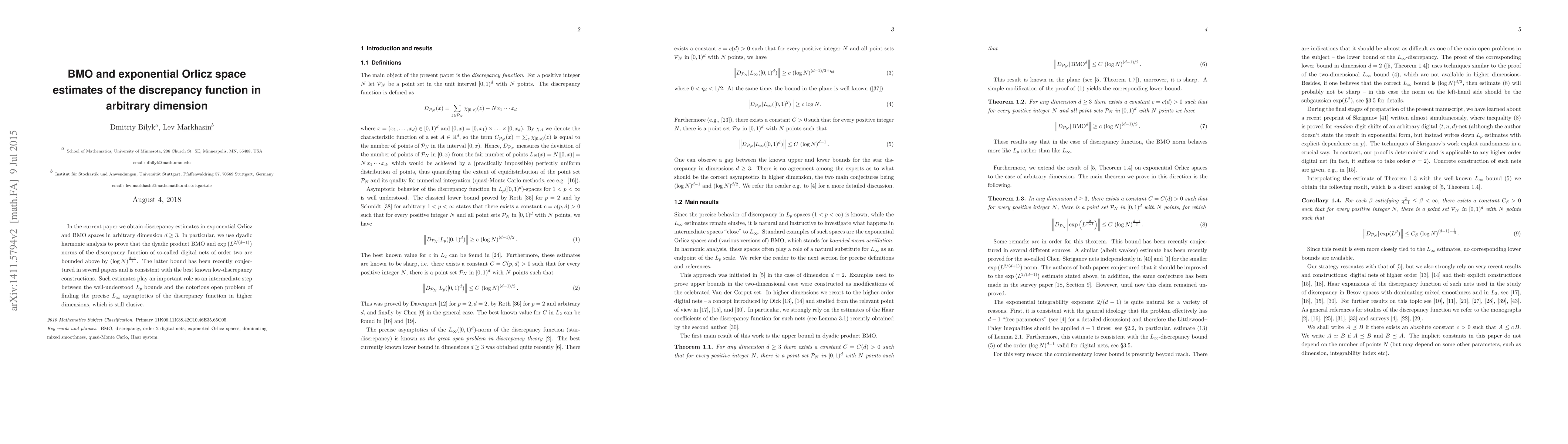 The paper provides new estimates of the discrepancy function in exponential Orlicz space (BMO) and BMO spaces in arbitrary dimension $d ge 3$, with implications for low-discrepancy constructions and a step towards understanding the asymptotics of the discrepancy function.