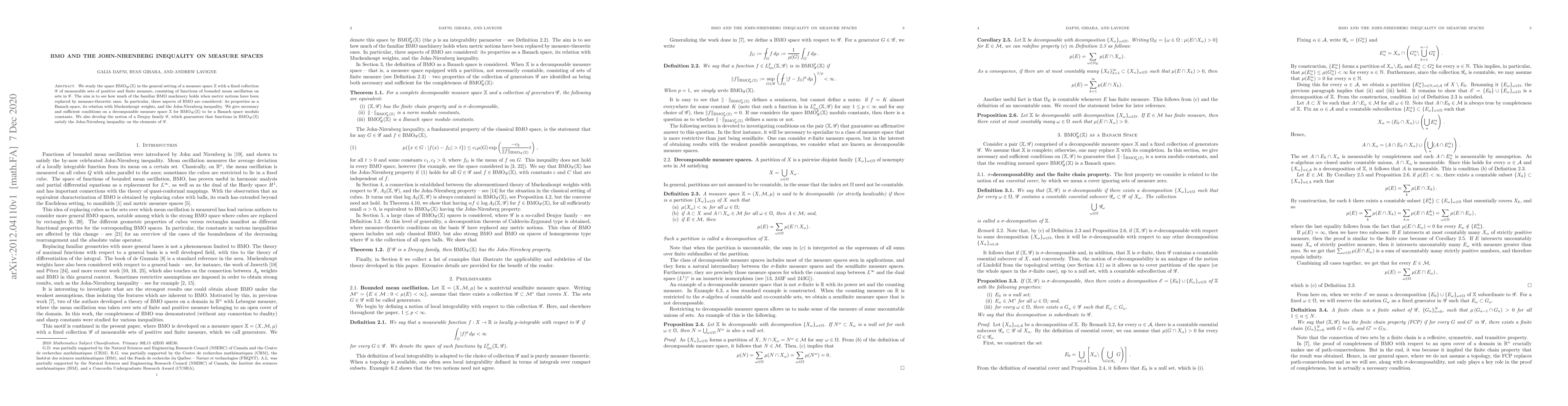 We study the space BMO in the general setting of a measure space $\mathbb{X}$ with a fixed collection $\mathscr{G}$ of measurable sets of positive and finite measure, consisting of functions of bounded mean oscillation on sets in $\mathscr{G}$. The aim is to see how much of the familiar BMO machinery holds when metric notions have been replaced by measure-theoretic ones. In particular, three aspects of BMO are considered: its properties as a Banach space, its relation with Muckenhoupt weights, and the John-Nirenberg inequality. We give necessary and sufficient conditions on a decomposable measure space $\mathbb{X}$ for BMO to be a Banach space modulo constants. We also develop the notion of a Denjoy family $\mathscr{G}$, which guarantees that functions in BMO satisfy the John-Nirenberg inequality on the elements of $\mathscr{G}$.