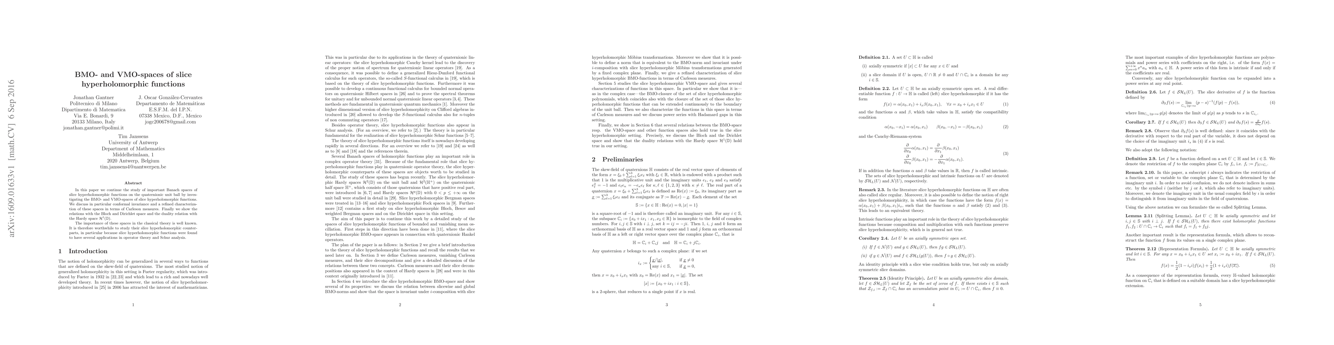 In this paper we continue the study of important Banach spaces of slice hyperholomorphic functions on the quaternionic unit ball by investigating the BMO- and VMO-spaces of slice hyperholomorphic functions. We discuss in particular conformal invariance and a refined characterization of these spaces in terms of Carleson measures. Finally we show the relations with the Bloch and Dirichlet space and the duality relation with the Hardy space $\mathcal{H}^1(\mathbb{D})$. The importance of these spaces in the classical theory is well known. It is therefore worthwhile to study their slice hyperholomorphic counterparts, in particular because slice hyperholomorphic functions were found to have several applications in operator theory and Schur analysis.