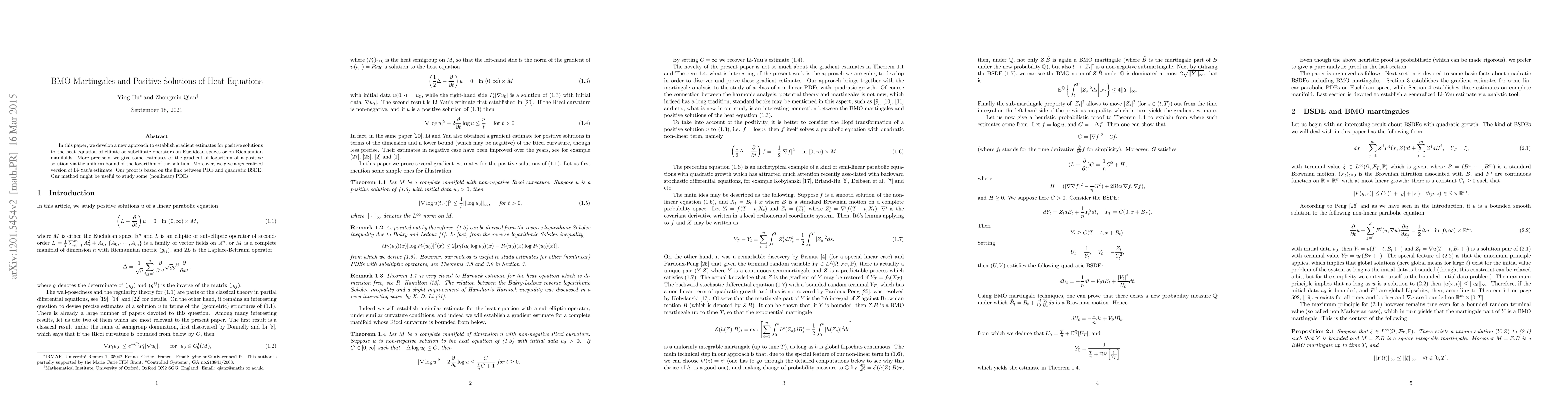 In this paper, we develop a new approach to establish gradient estimates for positive solutions to the heat equation of elliptic or subelliptic operators on Euclidean spaces or on Riemannian manifolds. More precisely, we give some estimates of the gradient of logarithm of a positive solution via the uniform bound of the logarithm of the solution. Moreover, we give a generalized version of Li-Yau's estimate. Our proof is based on the link between PDE and quadratic BSDE. Our method might be useful to study some (nonlinear) PDEs.