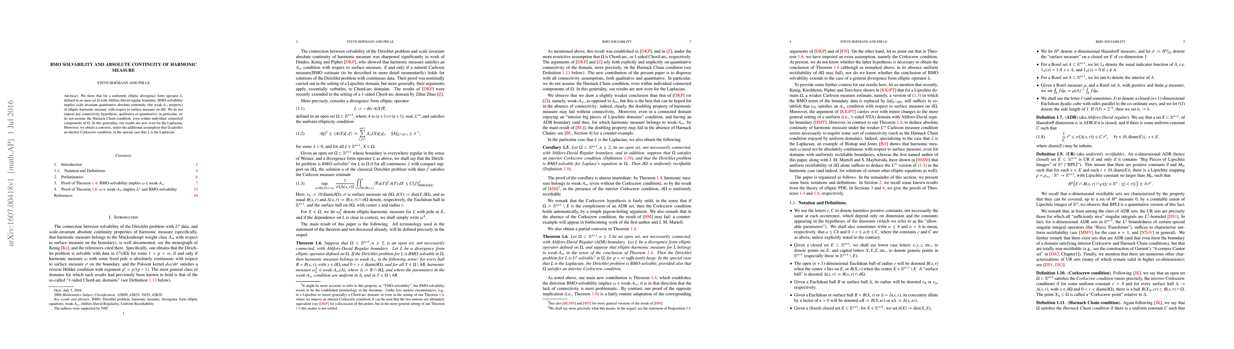 We show that for a uniformly elliptic divergence form operator $L$, defined in an open set $\Omega$ with Ahlfors-David regular boundary, BMO-solvability implies scale invariant quantitative absolute continuity (the weak-$A_\infty$ property) of elliptic-harmonic measure with respect to surface measure on $\partial \Omega$. We do not impose any connectivity hypothesis, qualitative or quantitative; in particular, we do not assume the Harnack Chain condition, even within individual connected components of $\Omega$. In this generality, our results are new even for the Laplacian. Moreover, we obtain a converse, under the additional assumption that $\Omega$ satisfies an interior Corkscrew condition, in the special case that $L$ is the Laplacian.