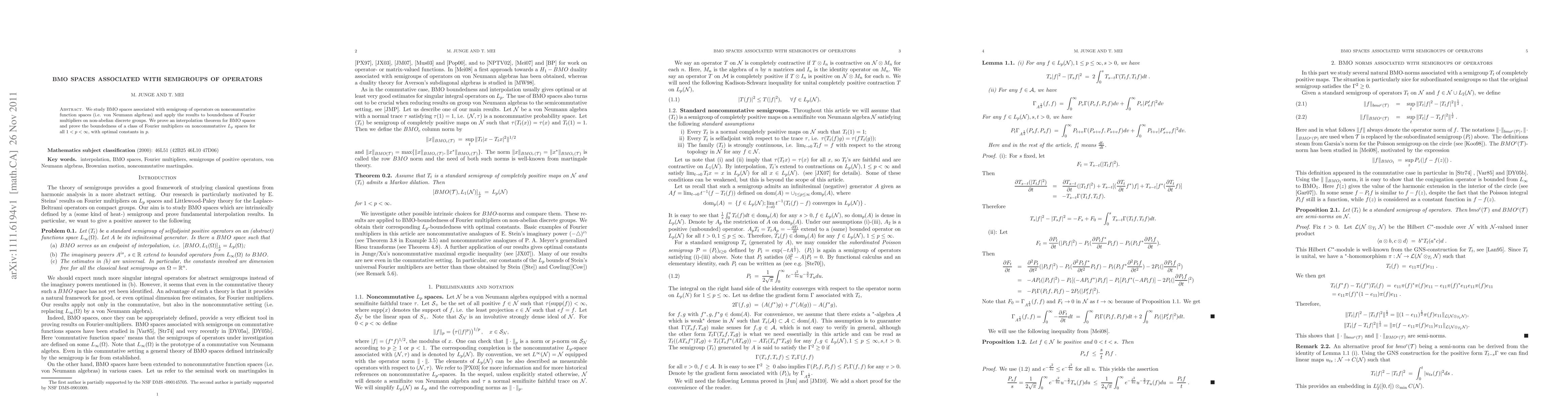 This paper investigates BMO spaces linked to semigroups of operators and demonstrates the boundedness of Fourier multipliers within these spaces. It establishes a universal interpolation theorem for BMO spaces and proves optimal bounds for a class of Fourier multipliers on noncommutative Lp spaces for all 1 < p < ∞.