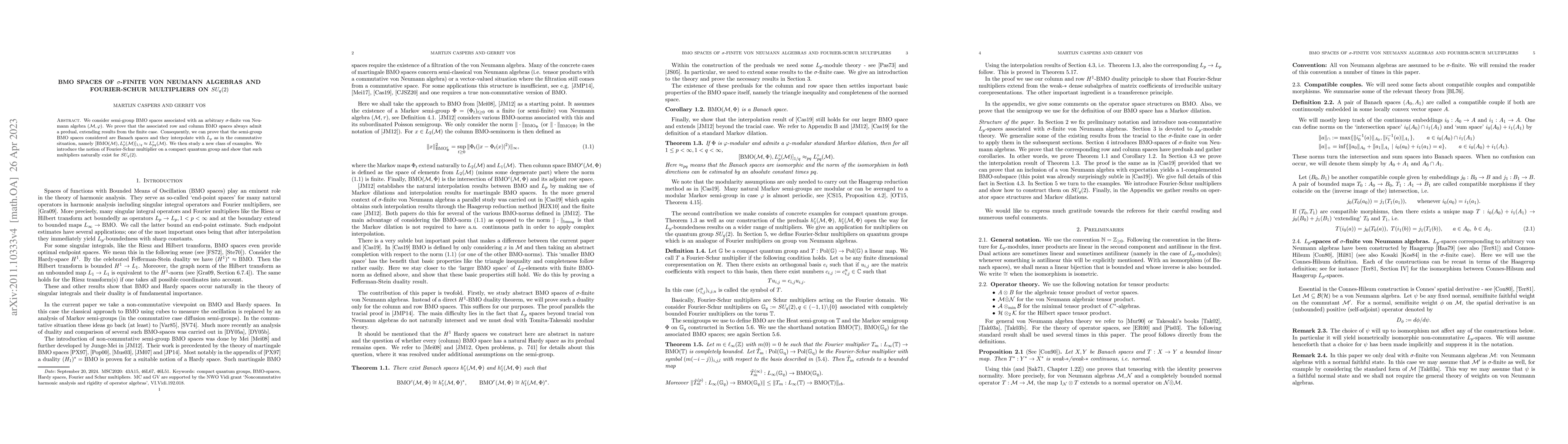 This paper explores semi-group BMO spaces linked to $\sigma$-finite von Neumann algebras, proving they have preduals and interpolate with $L_p$ spaces. It also introduces Fourier-Schur multipliers on the quantum group $SU_q(2)$ and demonstrates their existence.