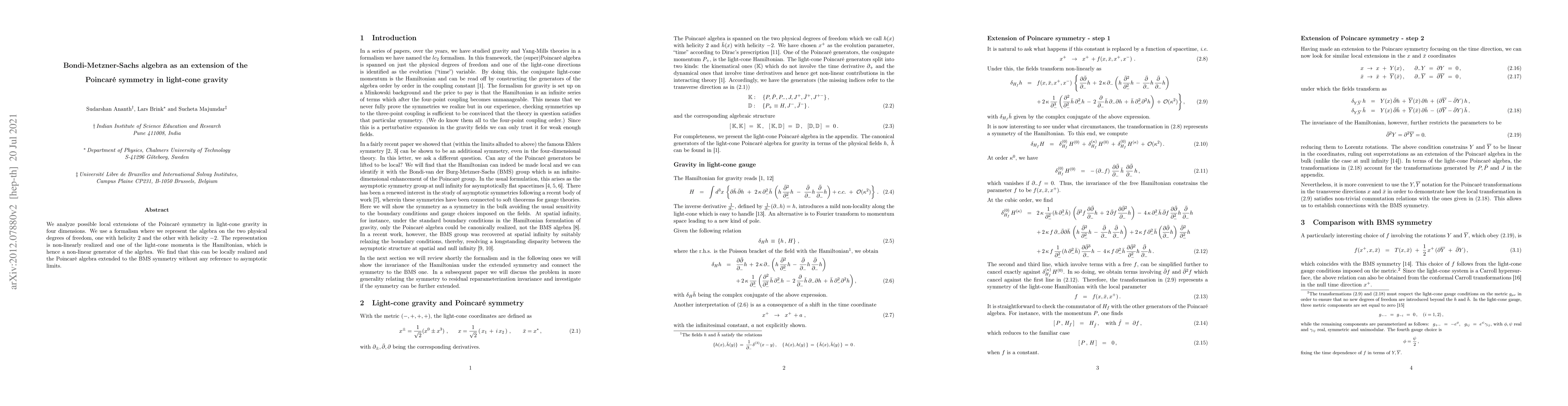 This paper explores local extensions of the Poincaré symmetry in light-cone gravity, revealing that the BMS algebra can be derived without asymptotic limits, using a formalism that nonlinearly realizes the algebra on two physical degrees of freedom with helicities 2 and -2.