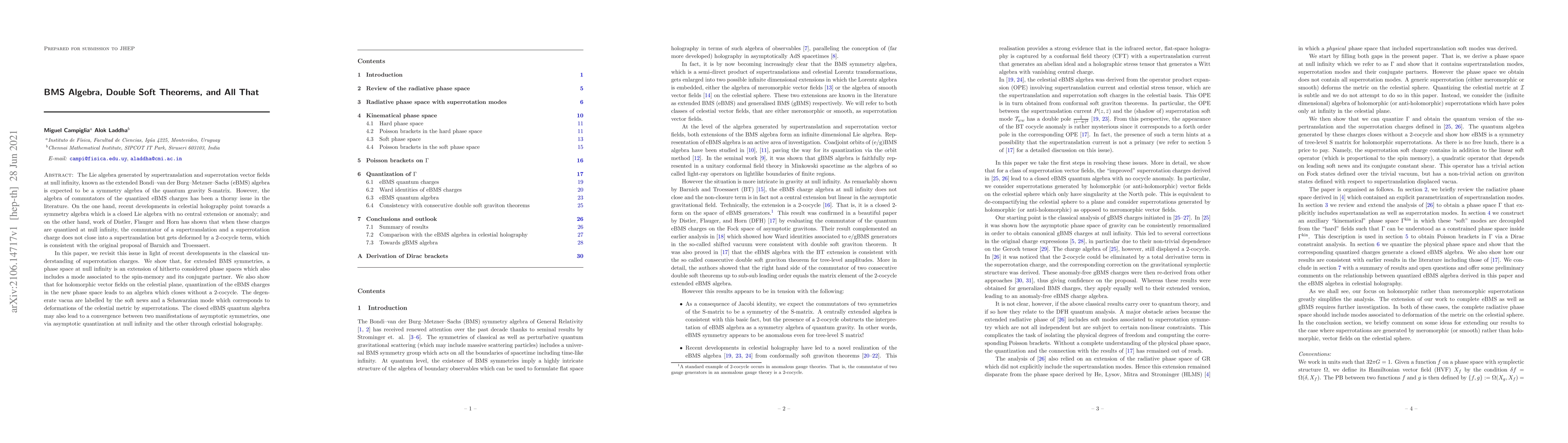 The Lie algebra generated by supertranslation and superrotation vector fields at null infinity, known as the extended BMS (eBMS) algebra is expected to be a symmetry algebra of the quantum gravity S matrix. However, the algebra of commutators of the quantized eBMS charges has been a thorny issue in the literature. On the one hand, recent developments in celestial holography point towards a symmetry algebra which is a closed Lie algebra with no central extension or anomaly, and on the other hand, work of Distler, Flauger and Horn has shown that when these charges are quantized at null infinity, the commutator of a supertranslation and a superrotation charge does not close into a supertranslation but gets deformed by a 2 cocycle term, which is consistent with the original proposal of Barnich and Troessaert. In this paper, we revisit this issue in light of recent developments in the classical understanding of superrotation charges. We show that, for extended BMS symmetries, a phase space at null infinity is an extension of hitherto considered phase spaces which also includes a mode associated to the spin memory and its conjugate partner. We also show that for holomorphic vector fields on the celestial plane, quantization of the eBMS charges in the new phase space leads to an algebra which closes without a 2 cocycle. The degenerate vacua are labelled by the soft news and a Schwarzian mode which corresponds to deformations of the celestial metric by superrotations. The closed eBMS quantum algebra may also lead to a convergence between two manifestations of asymptotic symmetries, one via asymptotic quantization at null infinity and the other through celestial holography.