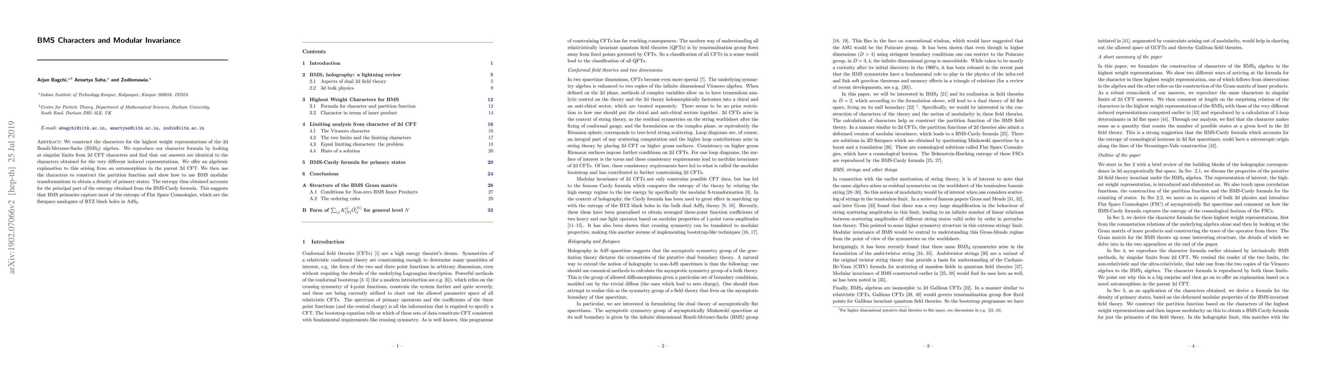 We construct the characters for the highest weight representations of the 3d Bondi-Metzner-Sachs (BMS$_3$) algebra. We then use these to construct the partition function and show how to use BMS modular transformations to obtain a density of primary states. The entropy thus obtained accounts for the principle part of the entropy obtained from the BMS-Cardy formula. This suggests that BMS primaries capture most of the entropy of Flat Space Cosmologies, which are the flatspace analogues of BTZ black holes in AdS$_3$. We reproduce our character formula by looking at singular limits from 2d CFT characters and find that our answers are identical to the characters obtained for the very different induced representations. We offer an algebraic explanation to this arising from a (to the best of our knowledge) novel automorphism in the parent 2d CFT.
