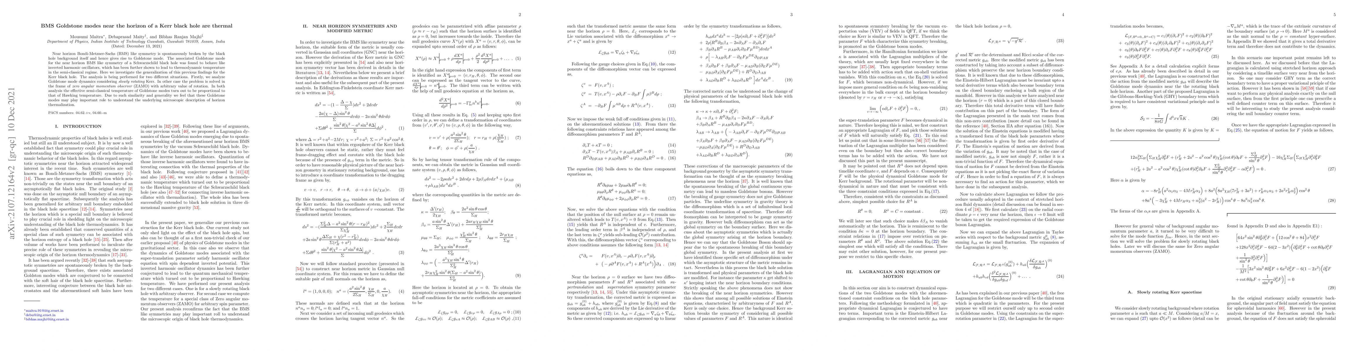 Near horizon Bondi-Metzner-Sachs (BMS) like symmetry is spontaneously broken by the black hole background itself and hence gives rise to Goldstone mode. The associated Goldstone mode for the near horizon BMS like symmetry of a Schwarzschild black hole was found to behave like inverted harmonic oscillators, which has been further shown to lead to thermodynamic temperature in the semi-classical regime. Here we investigate the generalization of this previous findings for the Kerr black hole. The analysis is being performed for two different situations. Firstly, we analyze Goldstone mode dynamics considering {\it slowly rotating} Kerr. In other case the problem is solved in the frame of {\it zero angular momentum observer} (ZAMO) with arbitrary value of rotation. In both analysis the effective semi-classical temperature of Goldstone modes turn out to be proportional to that of Hawking temperature. Due to such similarity and generality we feel that these Goldstone modes may play important role to understand the underlying microscopic description of horizon thermalization.