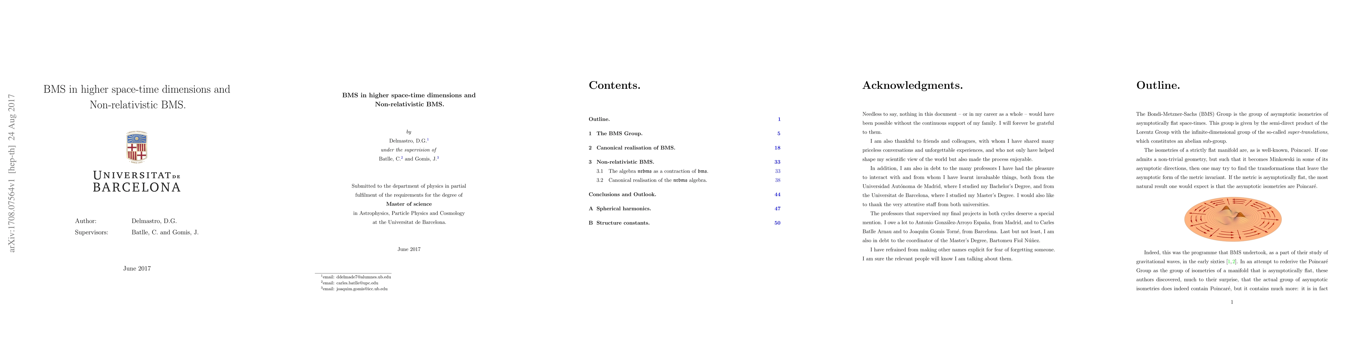 Summary: This master's thesis explores the BMS (Bondi-Metzner-Sachs) group in higher space-time dimensions and extends its framework to non-relativistic systems, providing insights into gravitational symmetries beyond the traditional relativistic context.