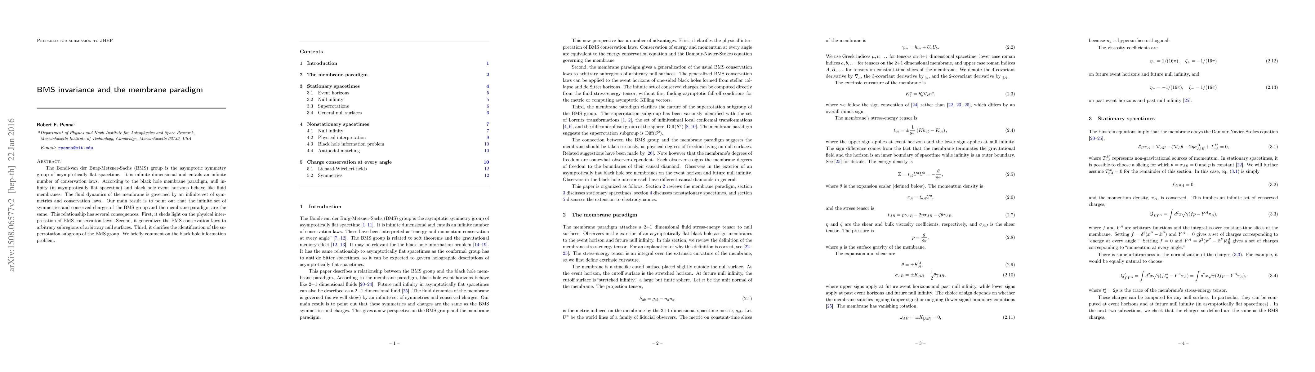 The paper establishes a relationship between the Bondi-van der Burg-Metzner-Sachs (BMS) group symmetries and the membrane paradigm, analyzing the fluid dynamics of black hole event horizons as membranes.
